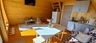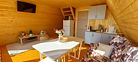На втором этаже два двуспальных места, так же есть на первом этаже раскладывающийся диван. Есть все необходимое для приготовления пищи, посуда, плитка, микроволновая печь. Столовые приборы, тарелки, чашки, бокалы. Свежее постельное белье и полотенца. Есть обеденный стол в домике. На террасе есть стол, скамейки. Дневное количество людей не ограничено.