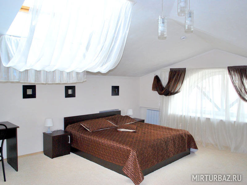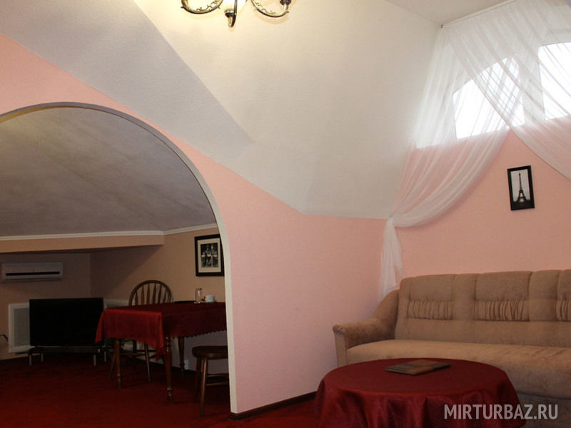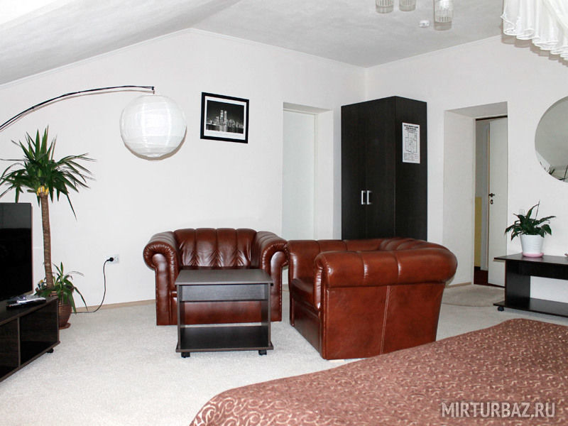 Номер из двух комнат, спальни и гостиной. В номере имеется SMART-TV, кондиционер, холодильник, широкая кровать с прикроватными тумбочками, диван-кровать, стол, шифоньер, комод с большим зеркалом. Ванная комната с подогревом пола, оснащена душевой кабиной, феном, туалетными принадлежностями (мыло, шампунь, гель для душа, шапочка для душа, зубной набор, бритвенный набор). Махровый халат и тапочки в индивидуальной упаковке.