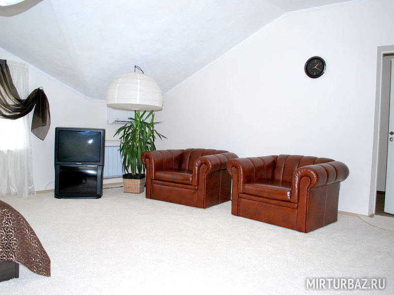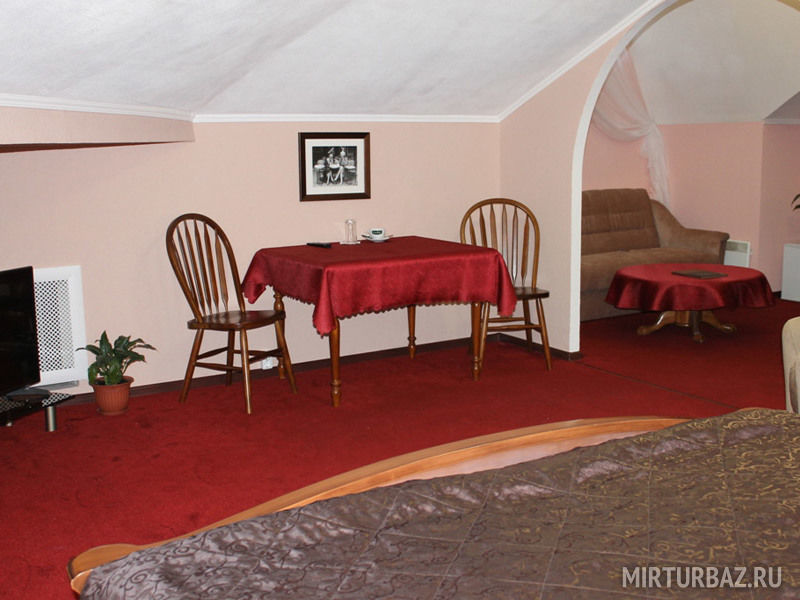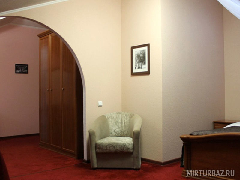 Номер имеет раздельные две комнаты. В комнате имеется SMART-TV, кондиционер, холодильник, широкая кровать с прикроватными тумбочками, два кресла, журнальный стол, письменный стол, шифоньер. Ванная комната с подогревом пола оснащена душевой кабиной, феном и всеми принадлежностями (мыло, шампунь, гель для душа, шапочка для душа, зубной набор, бритвенный набор). Махровый халат и тапочки в индивидуальной упаковке.