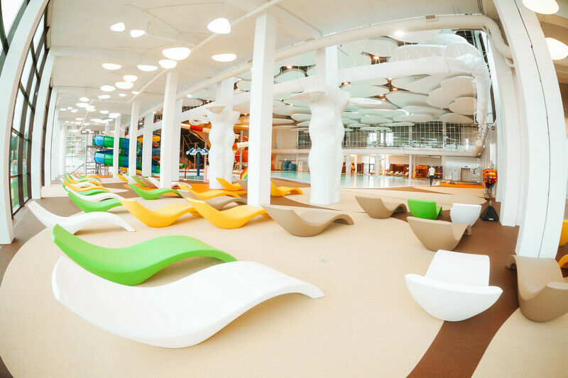 Для вас 13 водных аттракционов разной степени экстремальности, а также бассейны с теплой кристально - чистой водой. Взрослая зона включает 2 бассейна, 7 водных горок (труба, табаган, камикадзе, волна, космическая воронка, бабочка, сферы). В детской зоне расположены 5 водных горок (радуга, осьминог, кролик, дикая, детский комплекс), а также игровая зона на суше и водные пушки. На первом этаже в термальной зоне для вас работают бани и сауны: хаммам, солевая, финская, русская, лакониум, где вы сможете расслабиться и поправить свое здоровье, а после отдохнуть в джакузи под открытым небом. Температура воды здесь 38 градусов, что сделает купание даже в зимний период максимально - комфортным. На втором этаже можно перекусить в кафе с панорамными окнами.