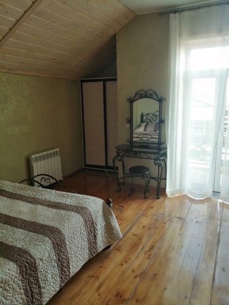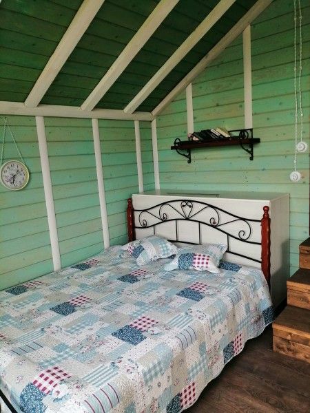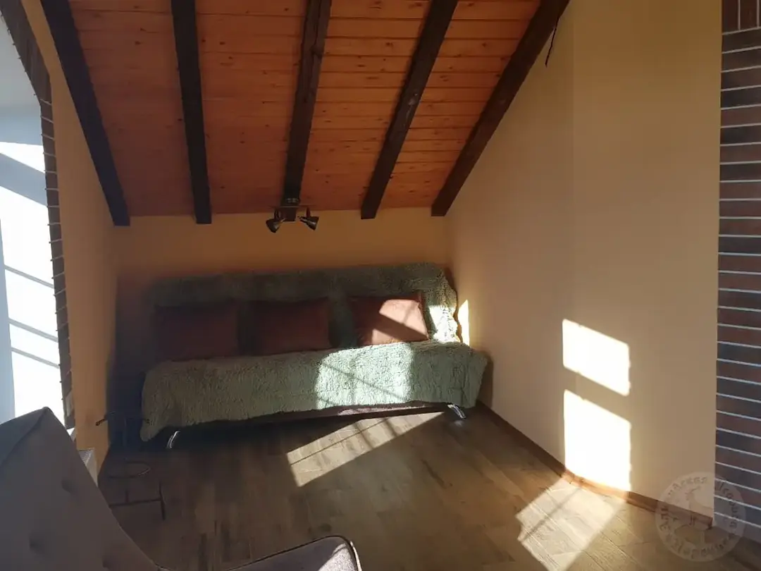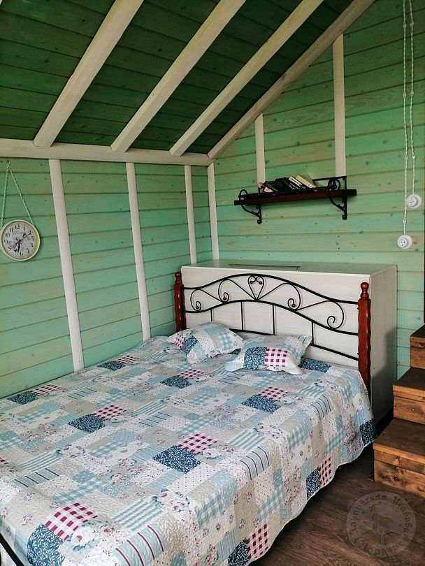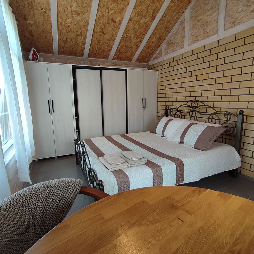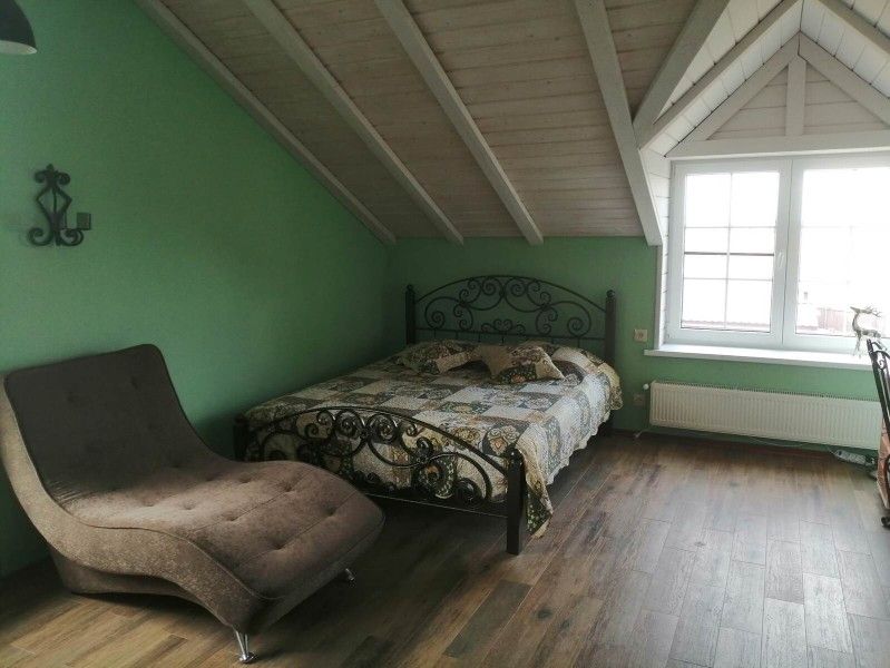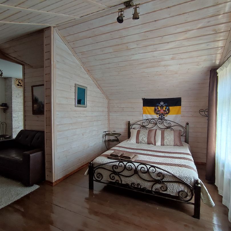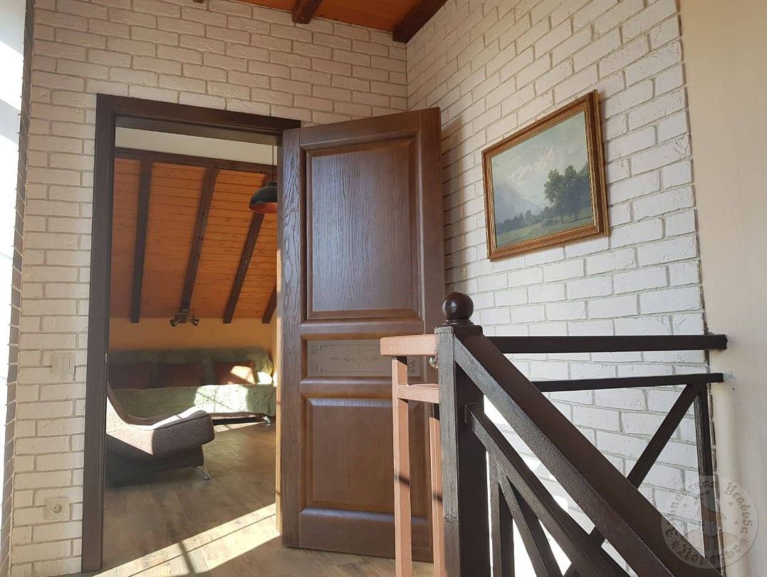 На втором этаже — две просторные спальни с двуместными кроватями, зал с диваном и креслом-шезлонгом, санузел с душем и открытый панорамный балкон.