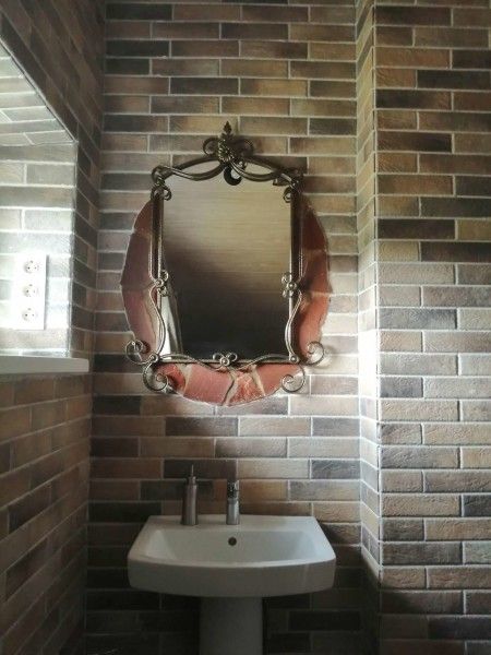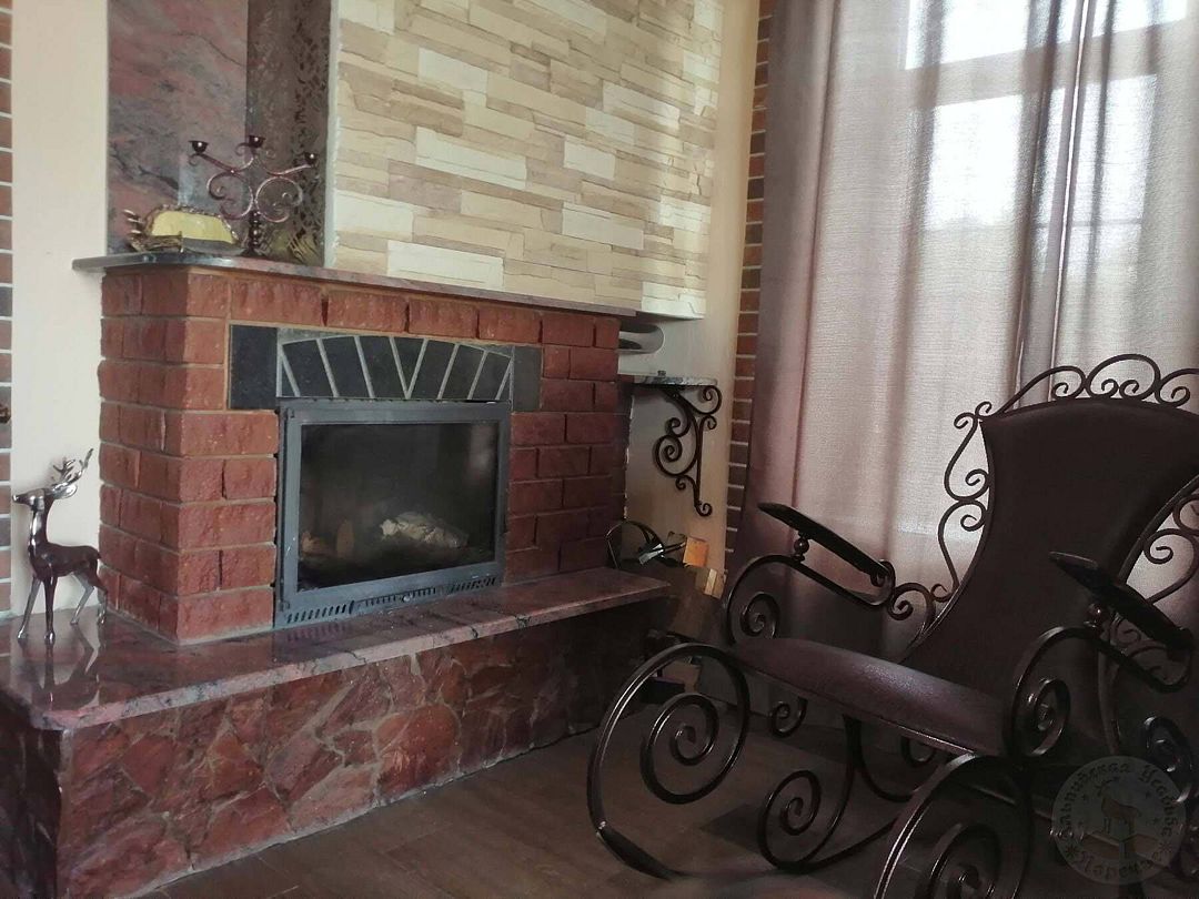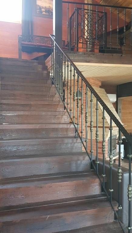 Интерьер дома выполнен в историческом стиле под «средневековье» — отделанные камнем стены, витиеватый лестничный марш, большие зеркала и металлическая ковка.