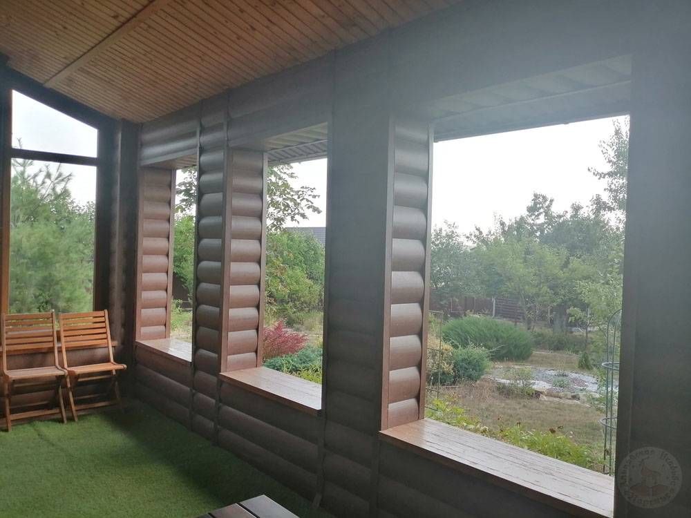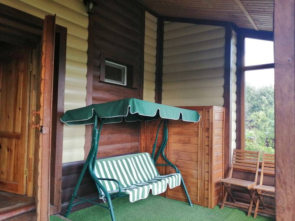 Через открытую веранду с востока — вид на сад и цветники. Северная дверь «Тироля» тоже выходит к деревьям, винограду и декоративной зелени. С западной стороны находится настоящий русский теремок.