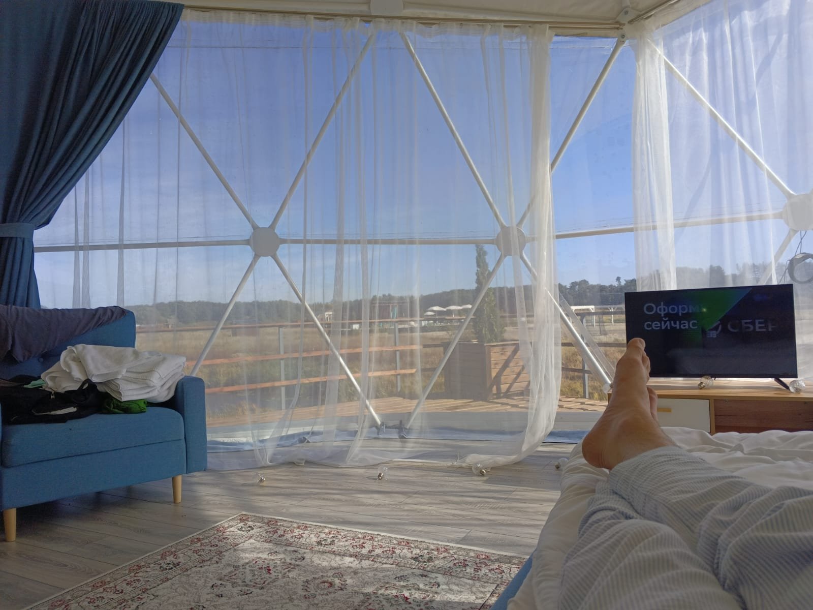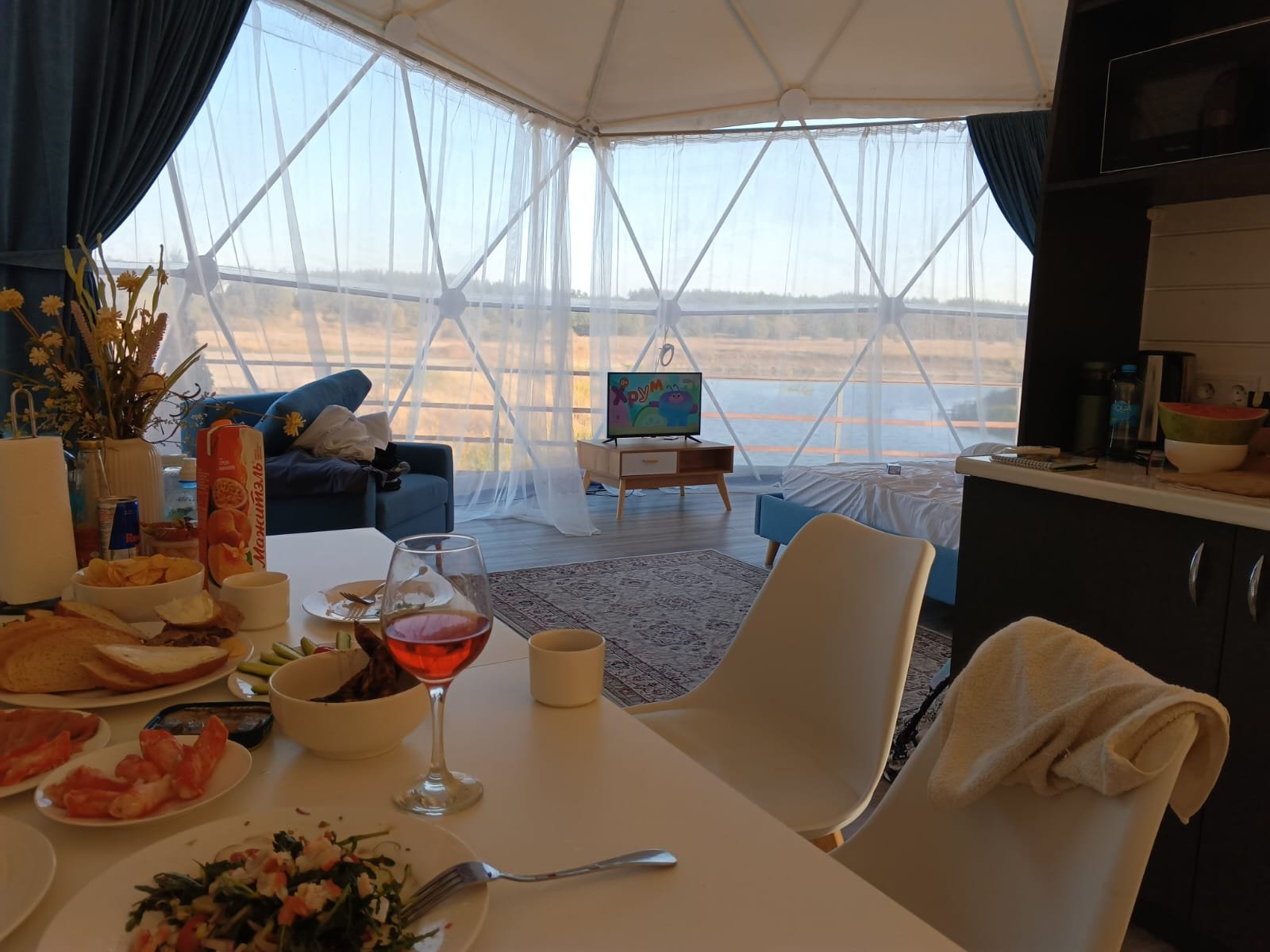 Этот глэмпинг отличается наличием очень большой террасы с видом на озеро и лес. Пространство отлично подойдет для поведения вашего камерного праздника на открытом воздухе! Дом оснащен мини-кухней и другими удобствами для вашего комфортного пребывания. Главная изюминка — просторная терраса с шезлонгами и зоной для барбекю, где вы сможете наслаждаться загородной идиллией.