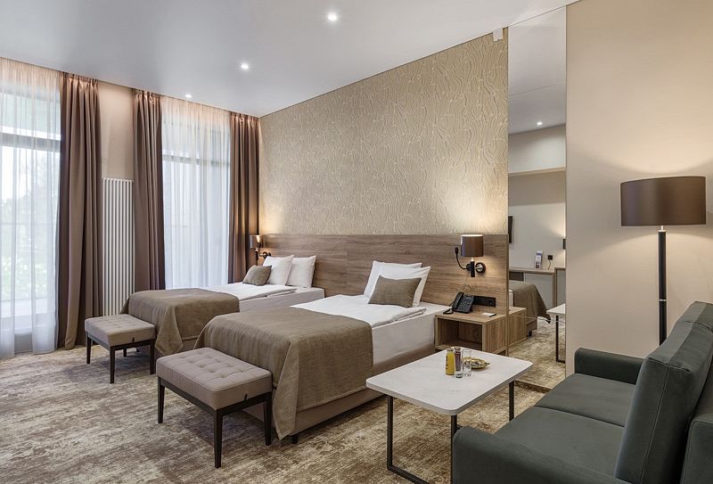 Семейный отдыхДостоинстваЭто совершенно новый санаторий, с красивыми интерьерами и разными категориями номеров. Питание - шведский стол, есть блюда на любой вкус. Великолепная зона бассейна.Все процедуры проводятся на новейшем оборудовании.Также очень понравились СПА обертывания, эфект виден сразу) Рекомендую всем!