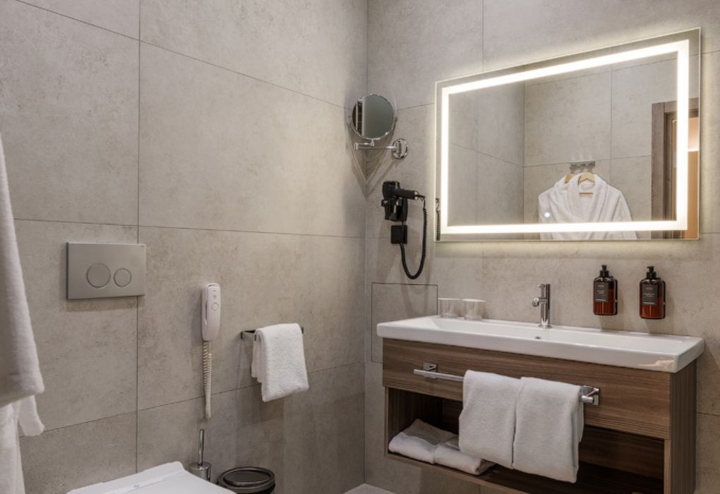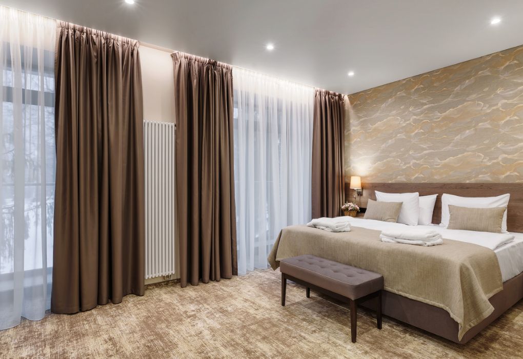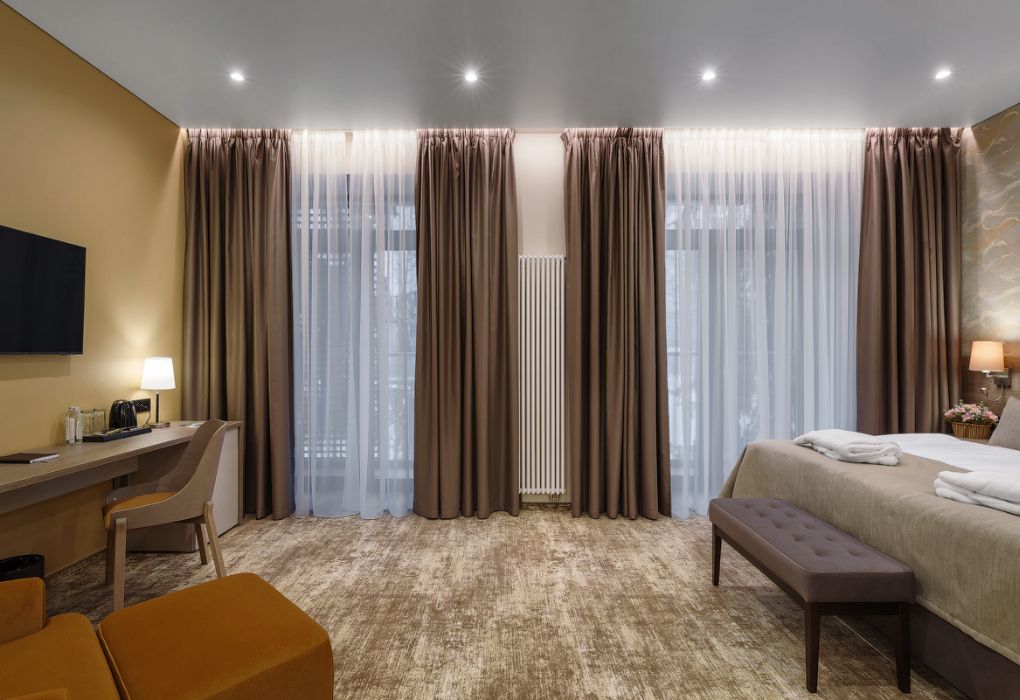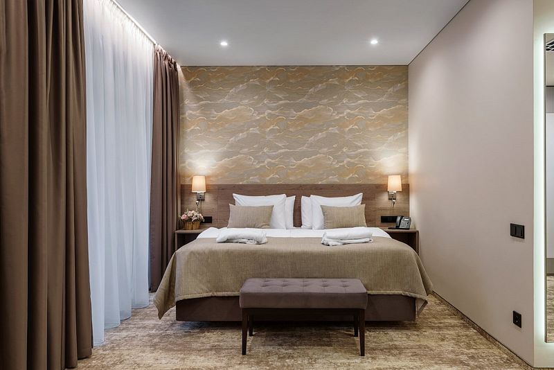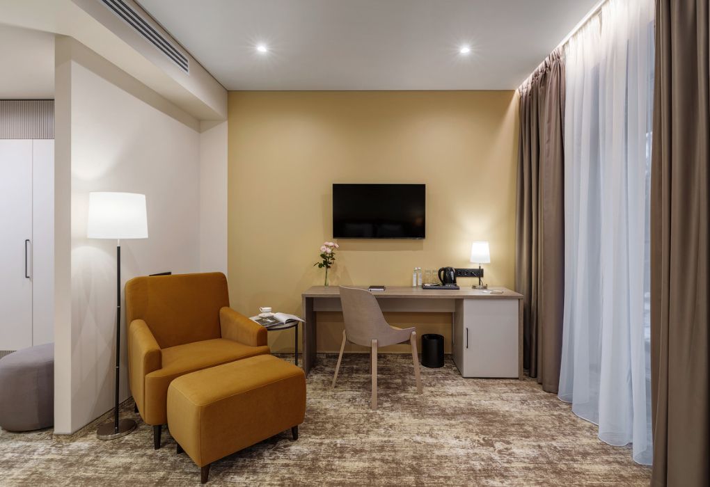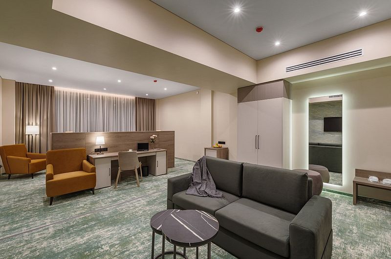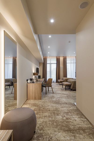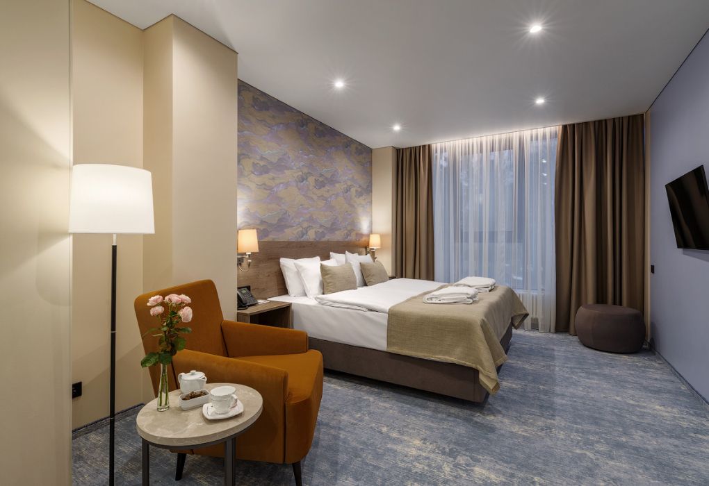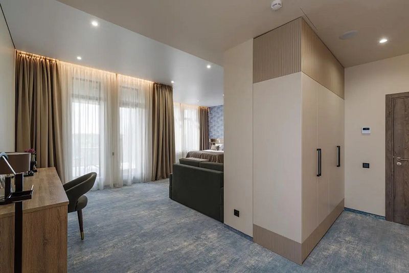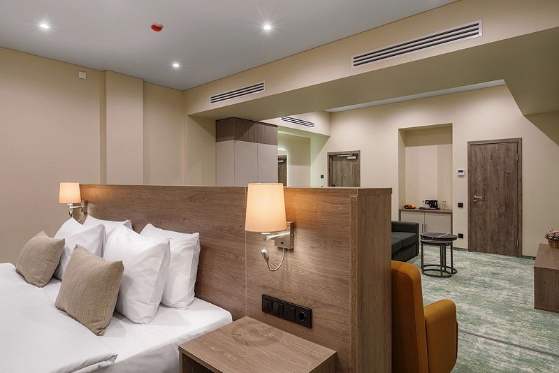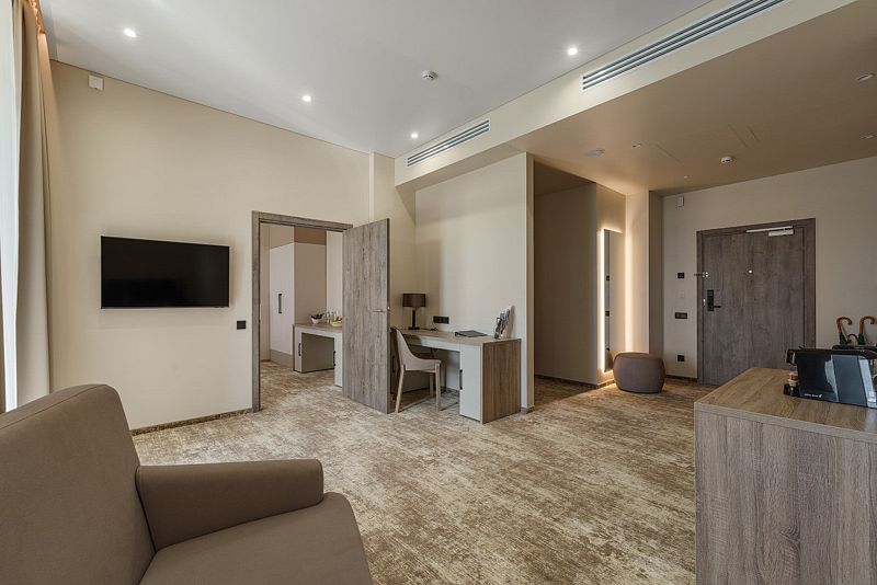 Номер Люкс представлен двумя комнатами: спальней и просторной гостиной с зоной отдыха с диваном, окна с панорамным видом и террасой.