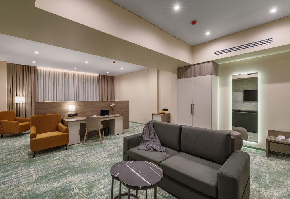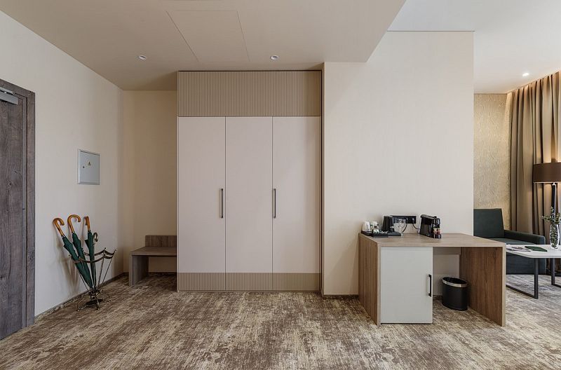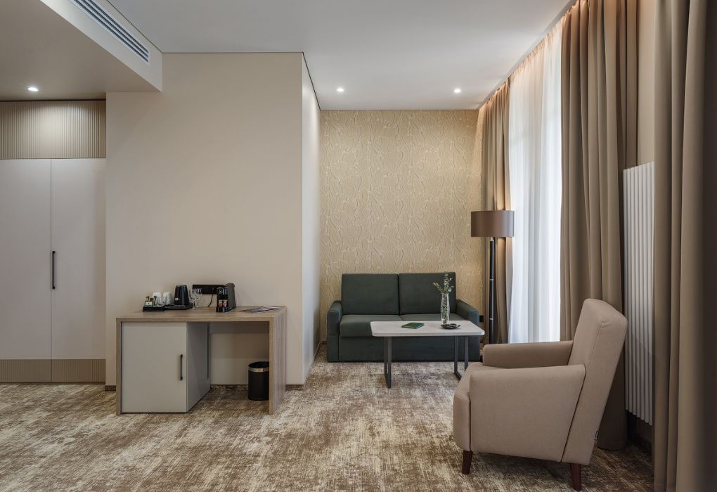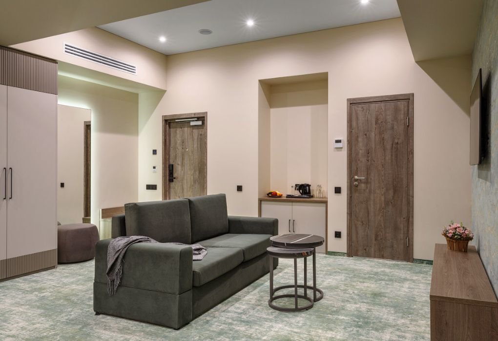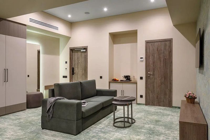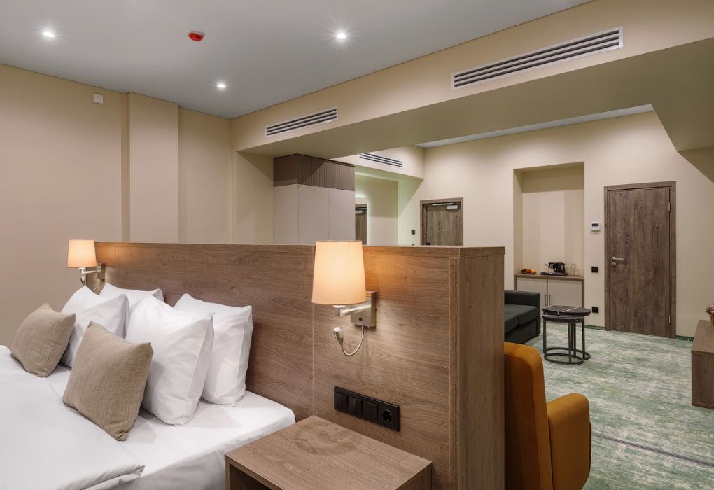 Люкс однокомнатный с двуспальной кроватью или двумя раздельными кроватями и диваном (две раздельные кровати предоставляются по запросу и при наличии возможности).