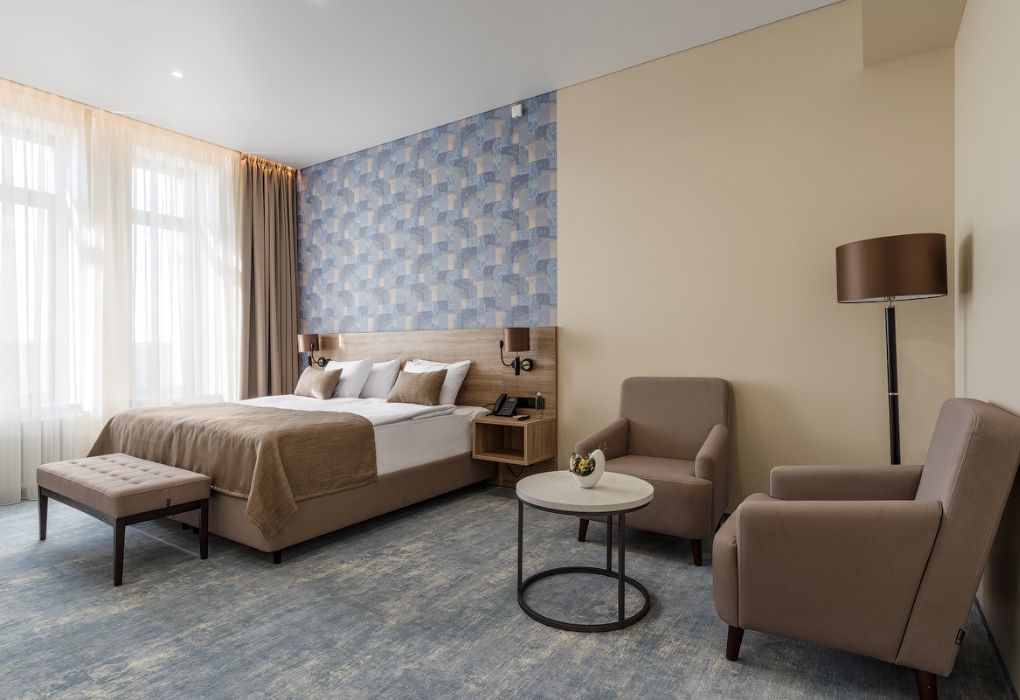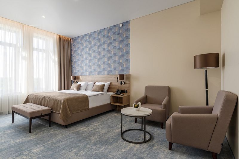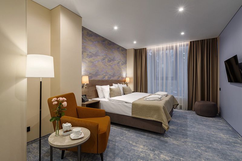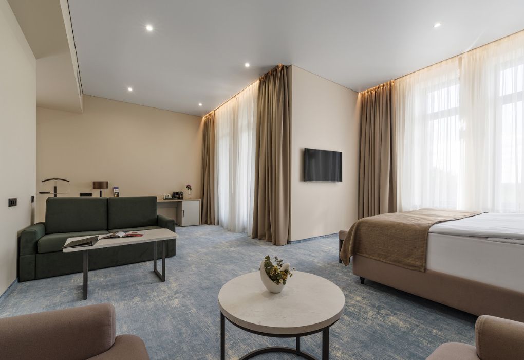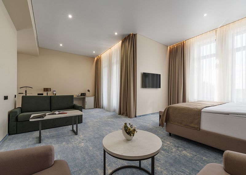 Просторный светлый номер повышенной комфортности с двуспальной кроватью, диваном, креслом и журнальным столиком.