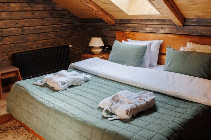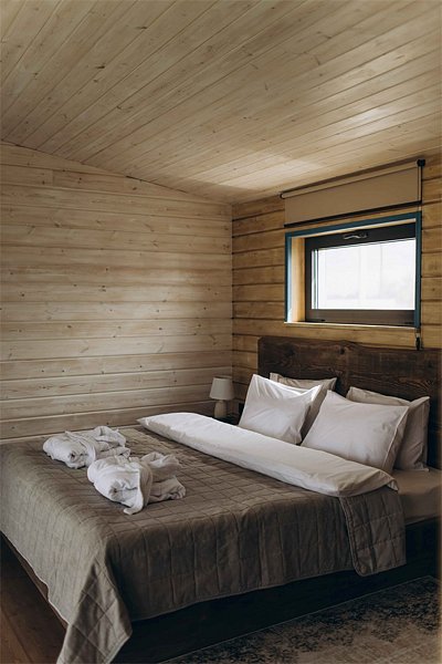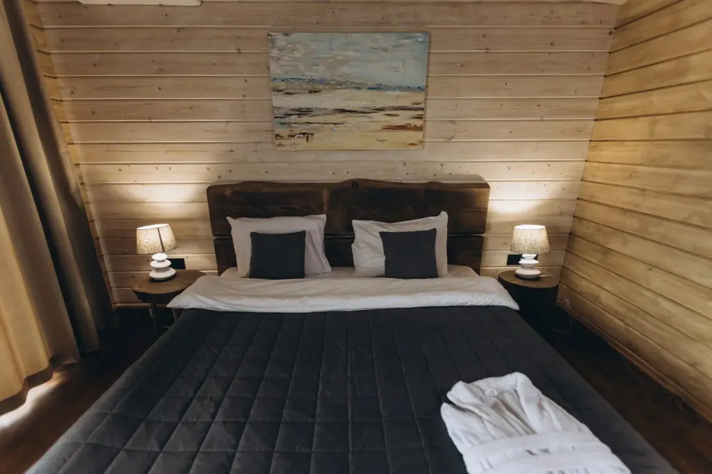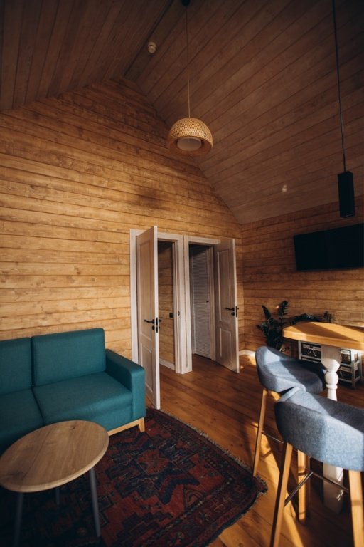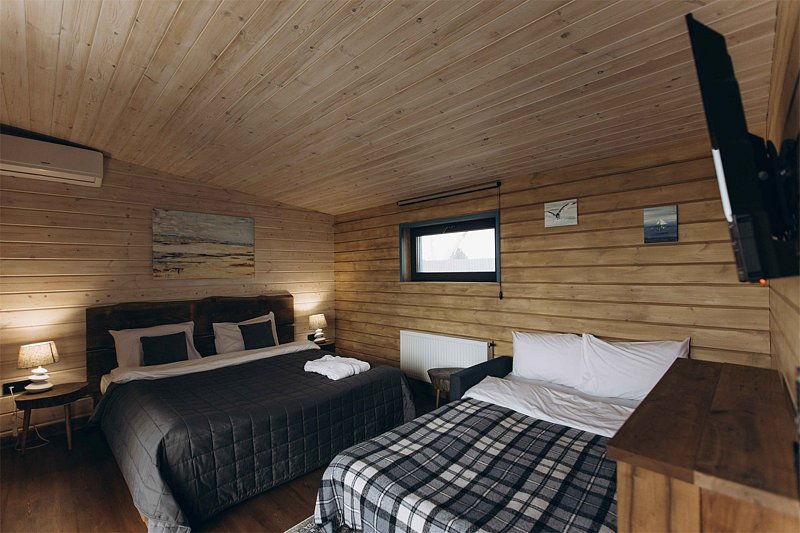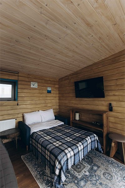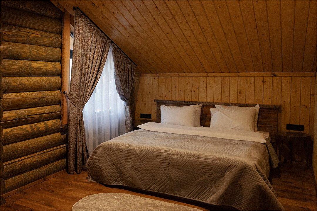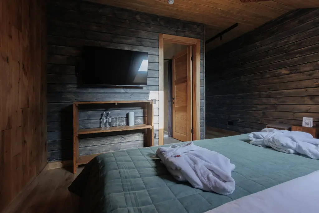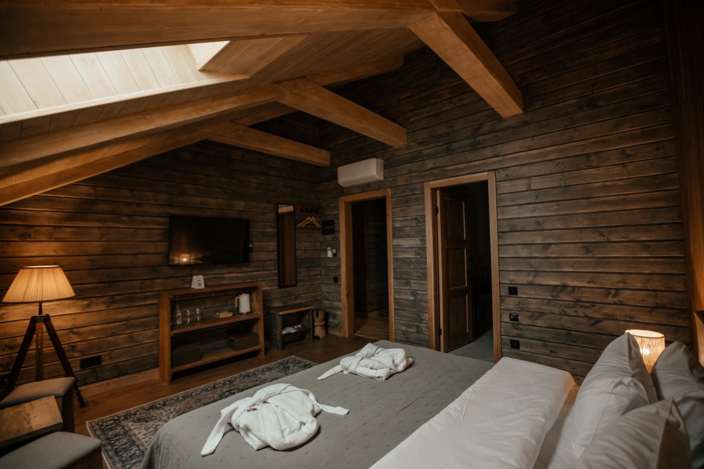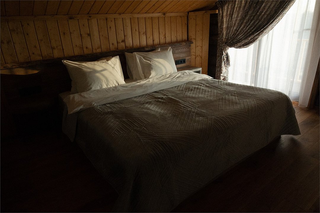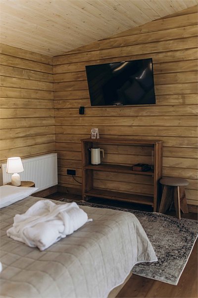 Для проживания гостям предоставляются укомплектованные домики с просторными кроватями, диваном для отдыха, большим плазменным телевизором, современной ванной комнатой с халатами, тапочками, косметикой и феном. Для детей предоставляются кроватки либо манежи.