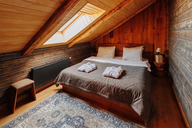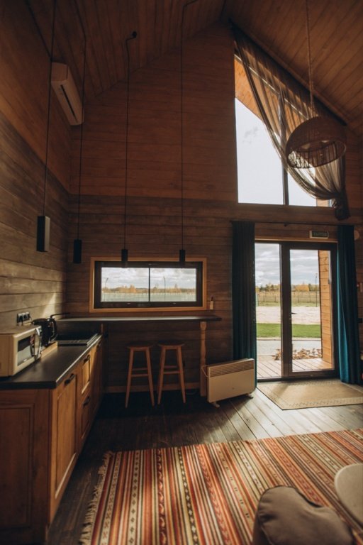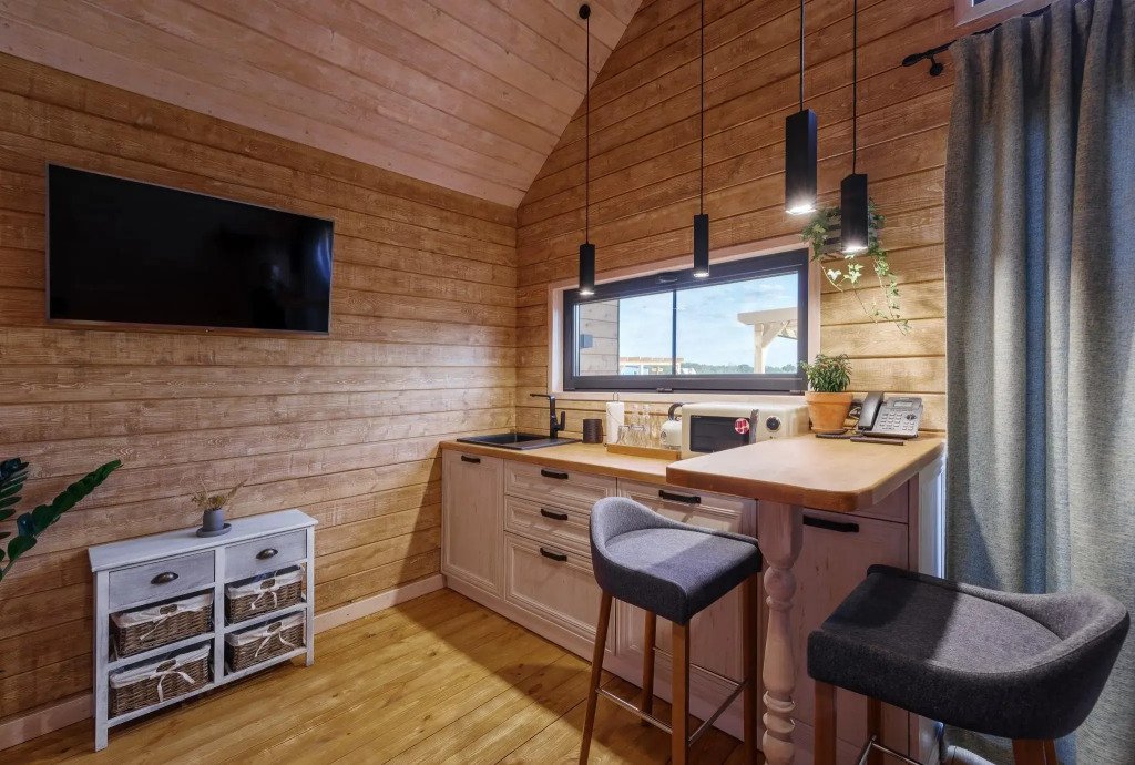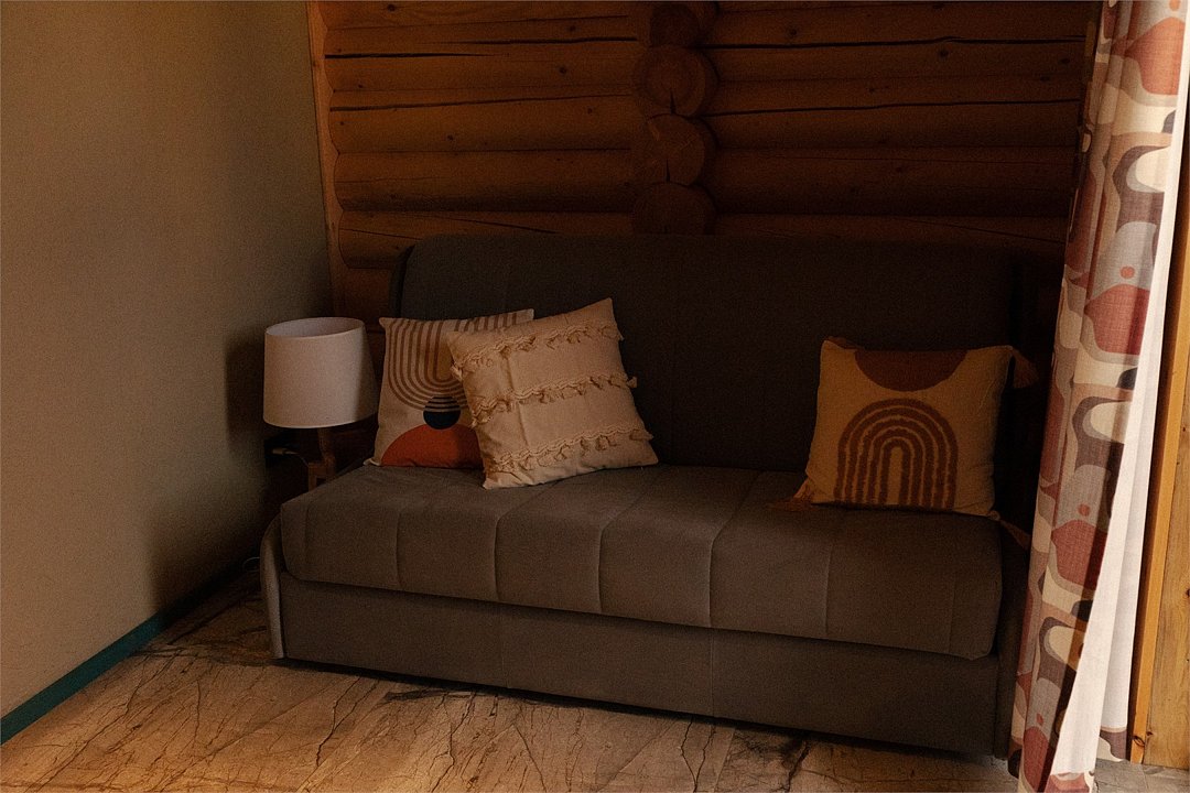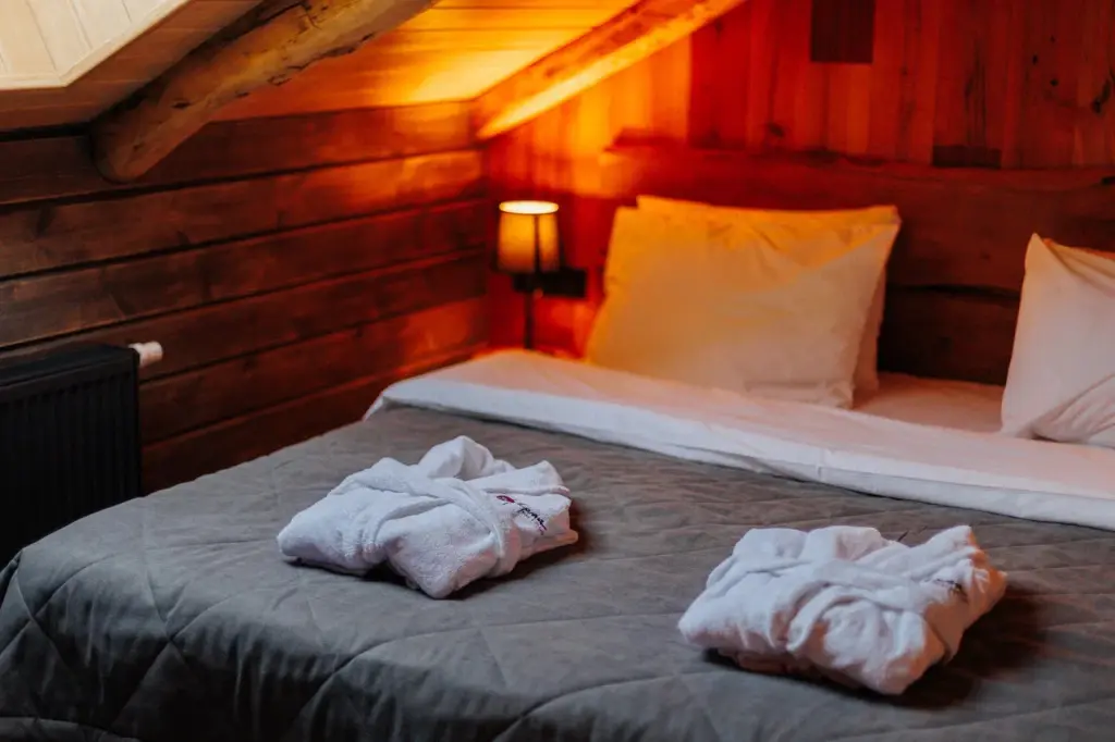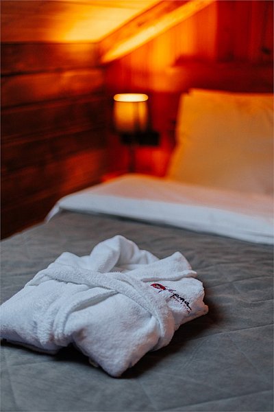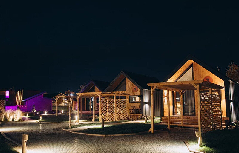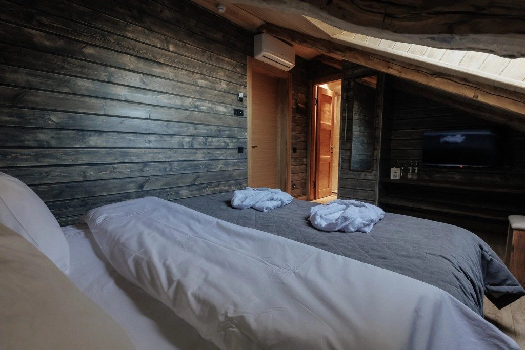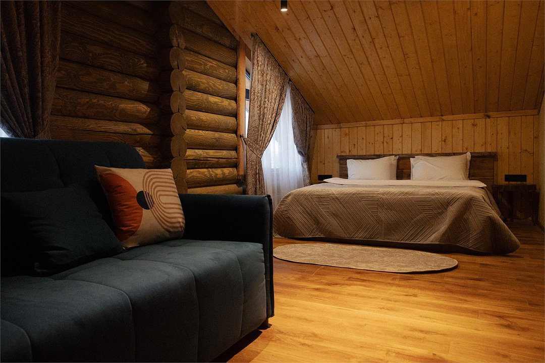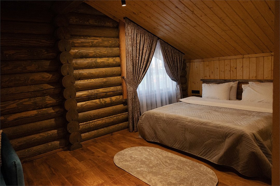 Для проживания гостям предоставляются укомплектованные домики с просторными кроватями, диваном для отдыха, большим плазменным телевизором, современной ванной комнатой с халатами, тапочками, косметикой и феном. Для детей предоставляются кроватки либо манежи.