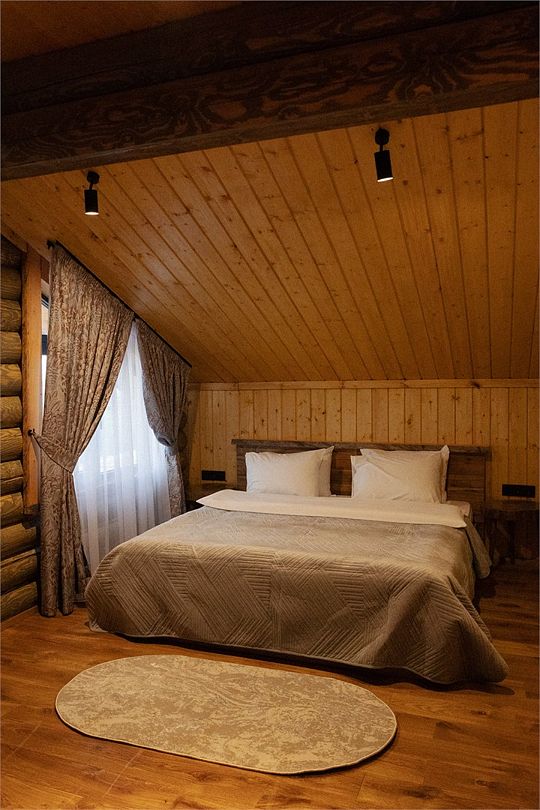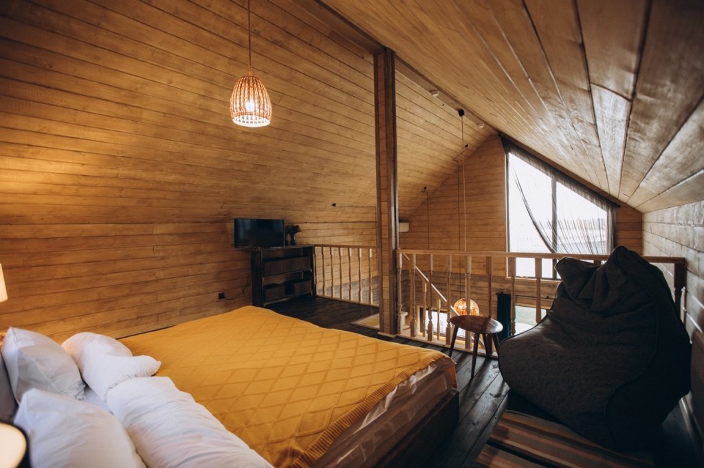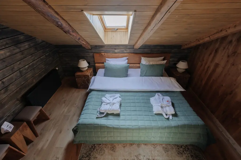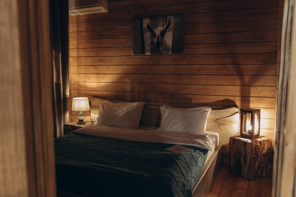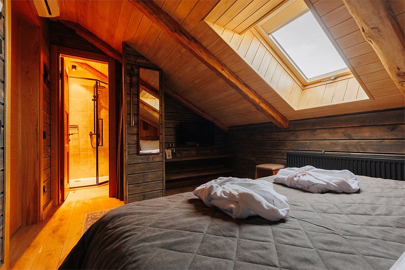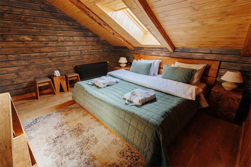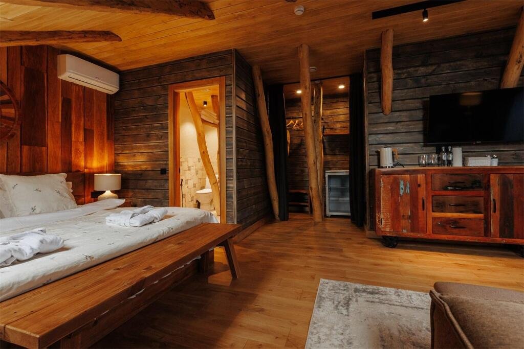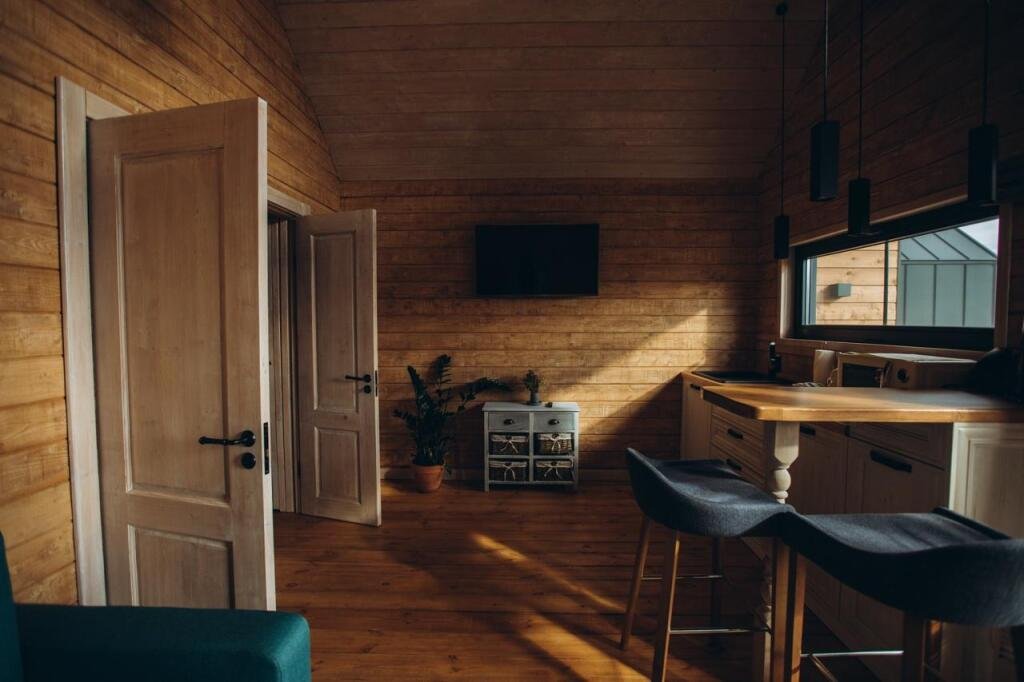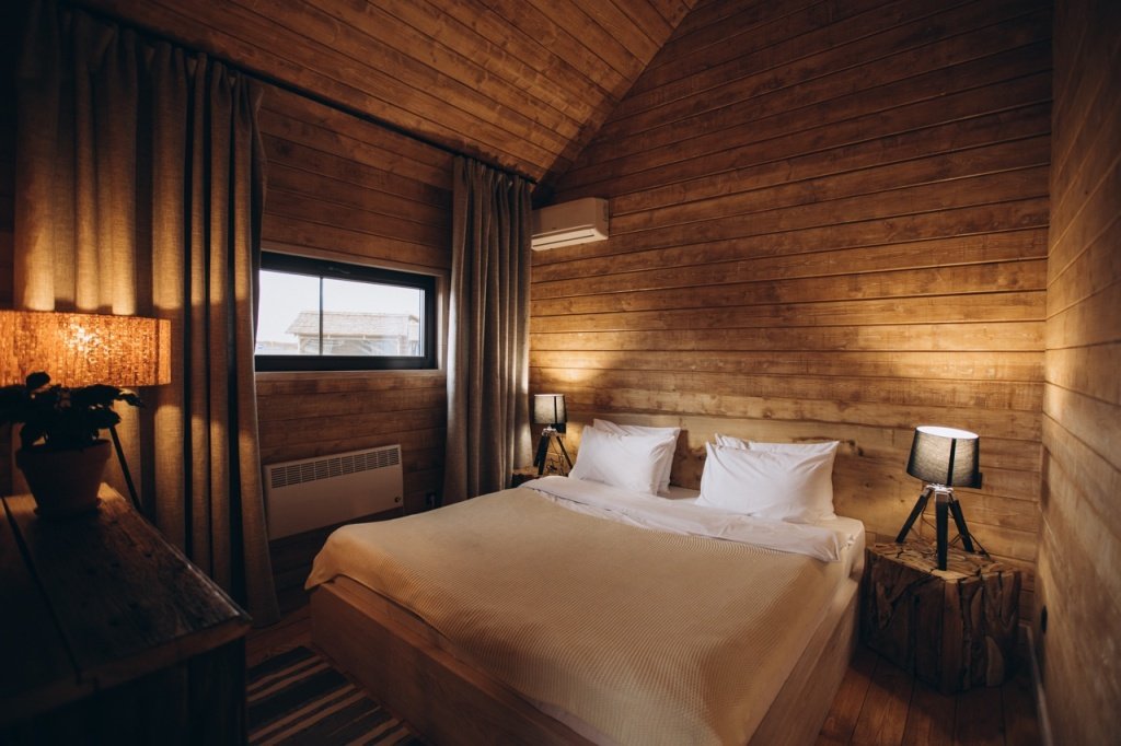 Для проживания гостям предоставляются укомплектованные домики с просторными кроватями, диваном для отдыха, большим плазменным телевизором, современной ванной комнатой с халатами, тапочками, косметикой и феном. Для детей предоставляются кроватки либо манежи.