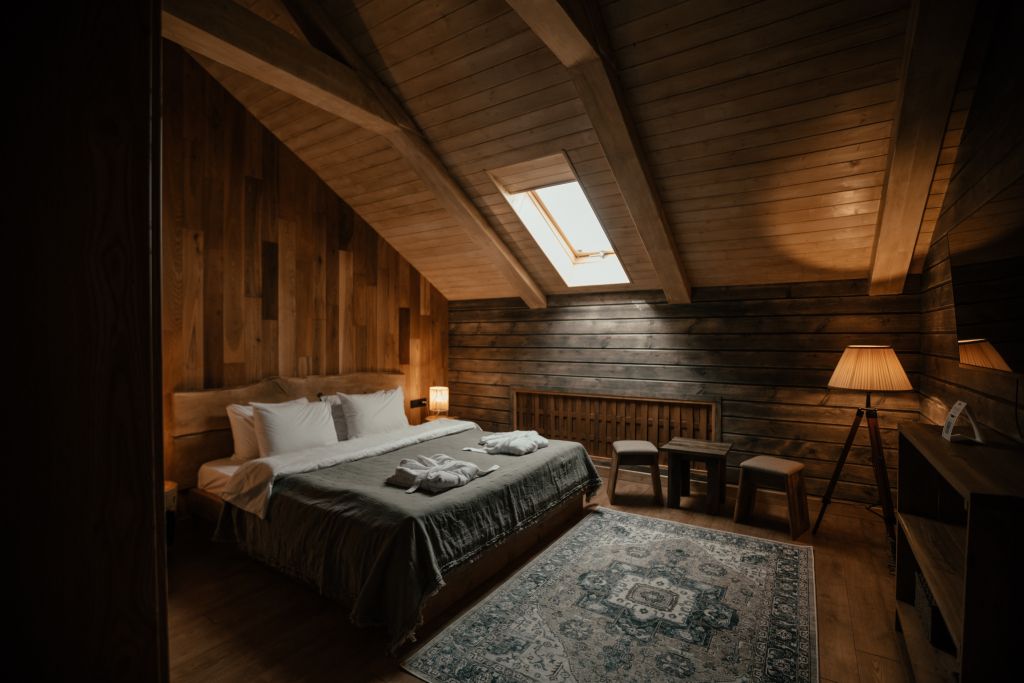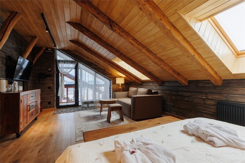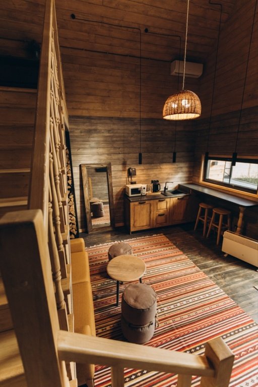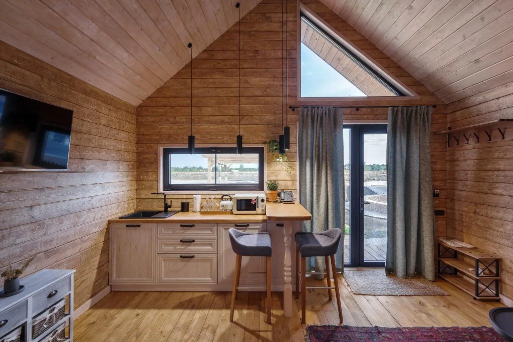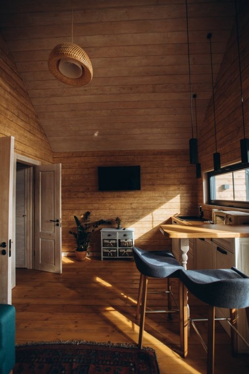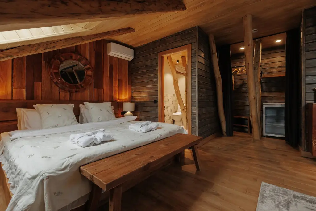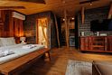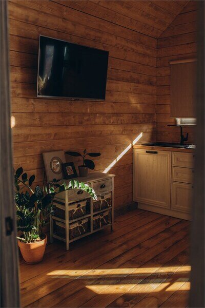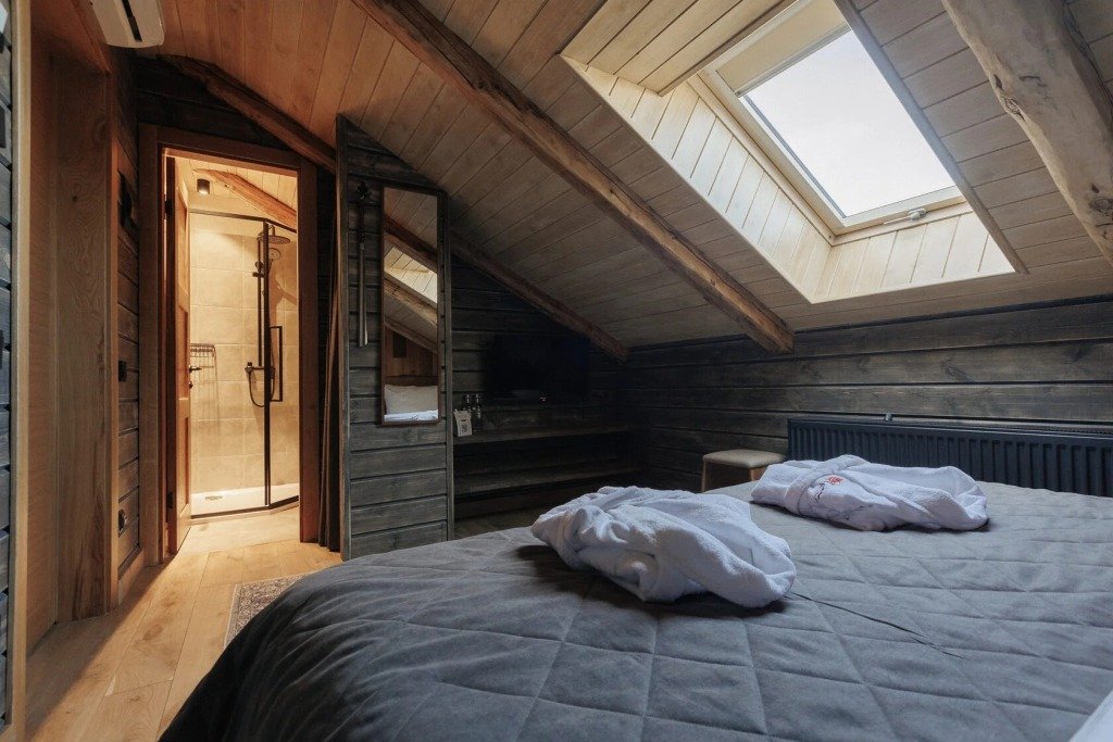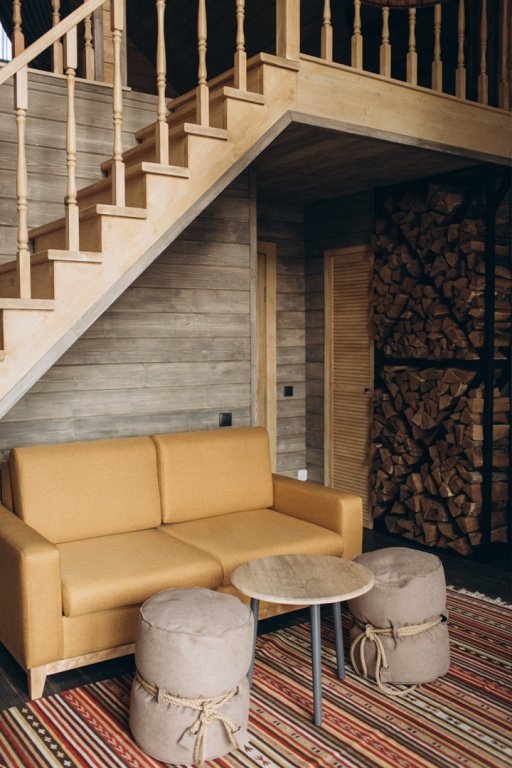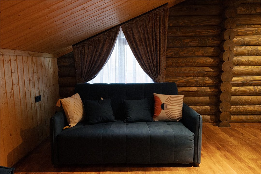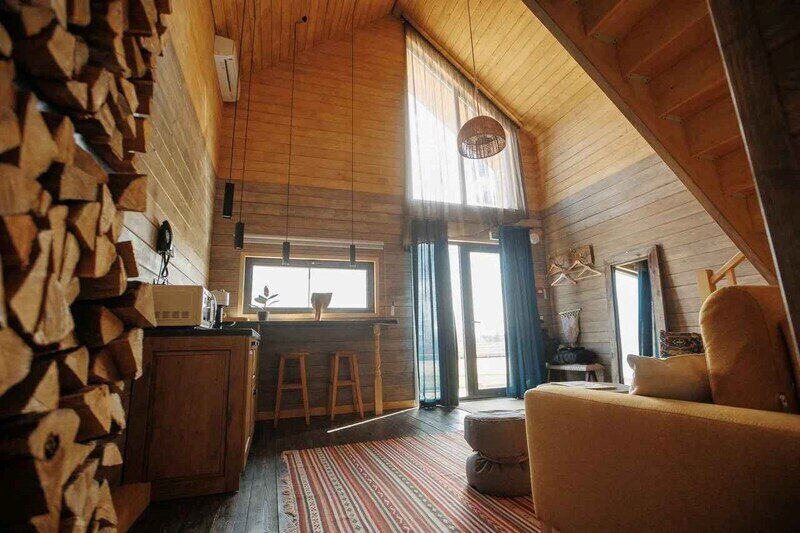 Для проживания гостям предоставляются укомплектованные домики с просторными кроватями, диваном для отдыха, большим плазменным телевизором, современной ванной комнатой с халатами, тапочками, косметикой и феном. Для детей предоставляются кроватки либо манежи.