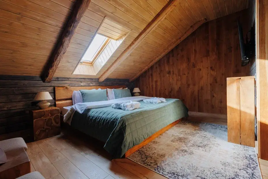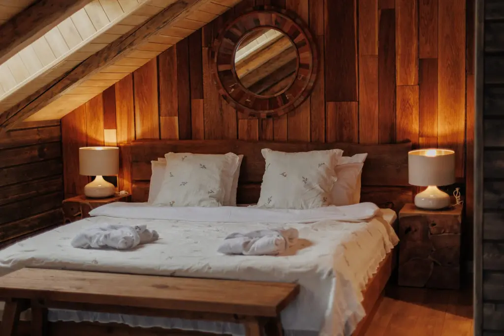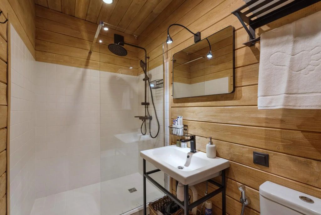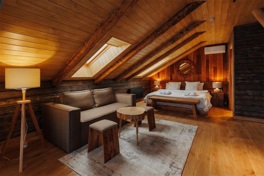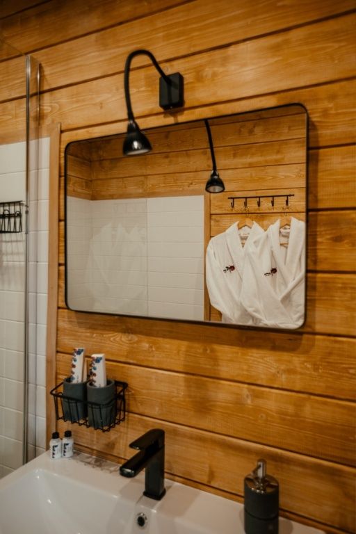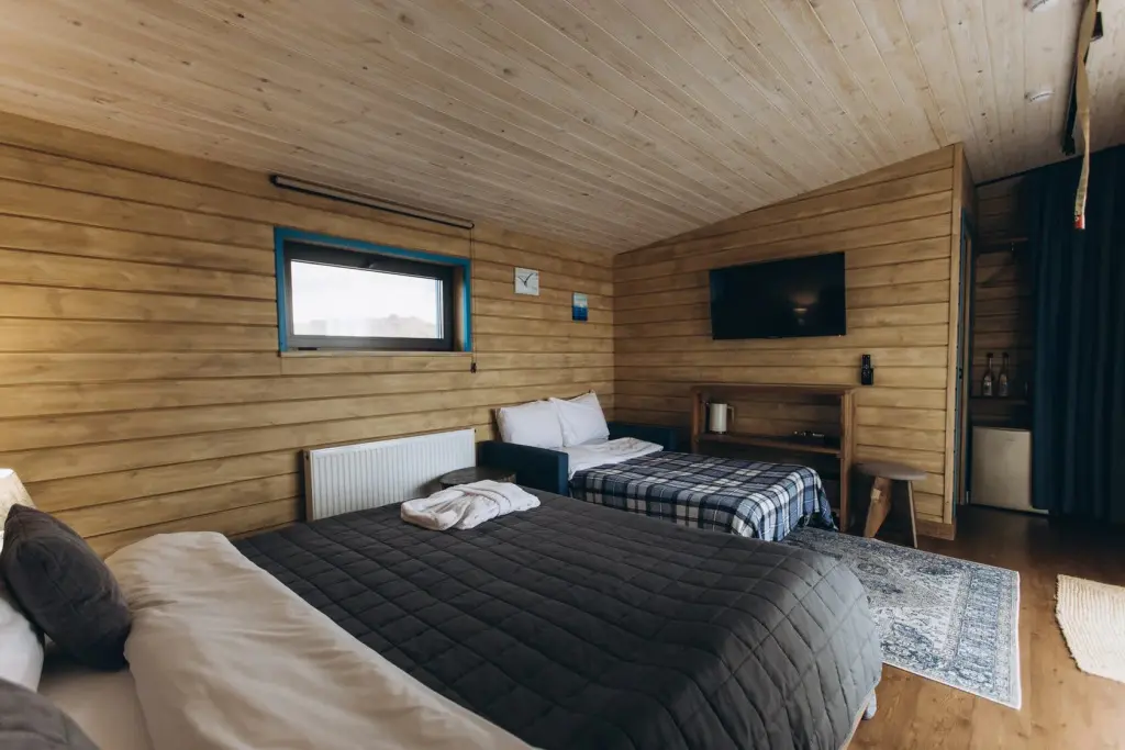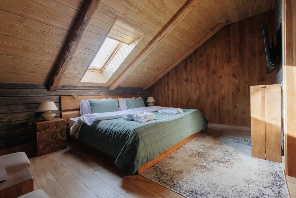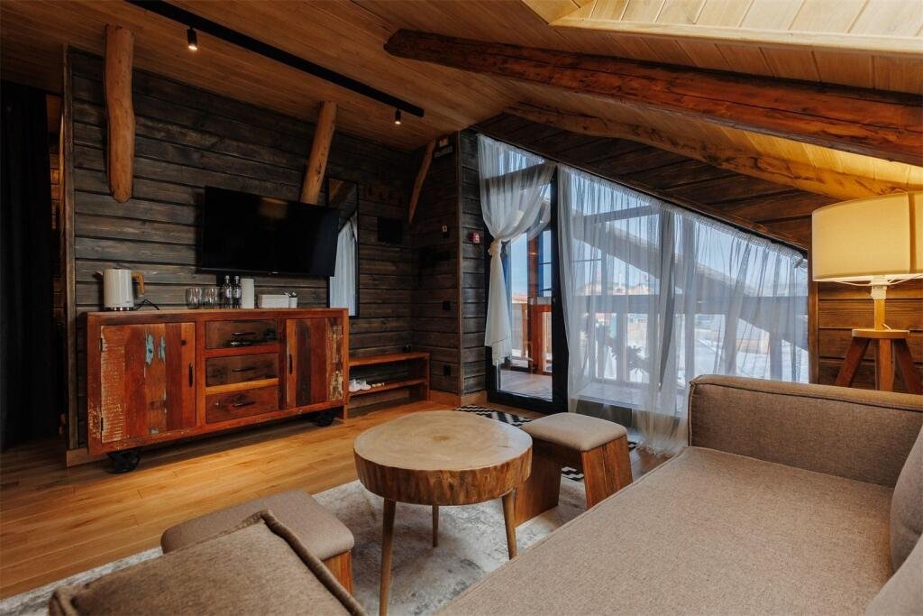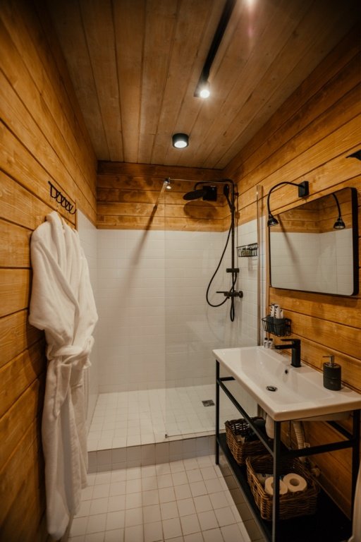 Для проживания гостям предоставляются укомплектованные домики с просторными кроватями, диваном для отдыха, большим плазменным телевизором, современной ванной комнатой с халатами, тапочками, косметикой и феном. Для детей предоставляются кроватки либо манежи.