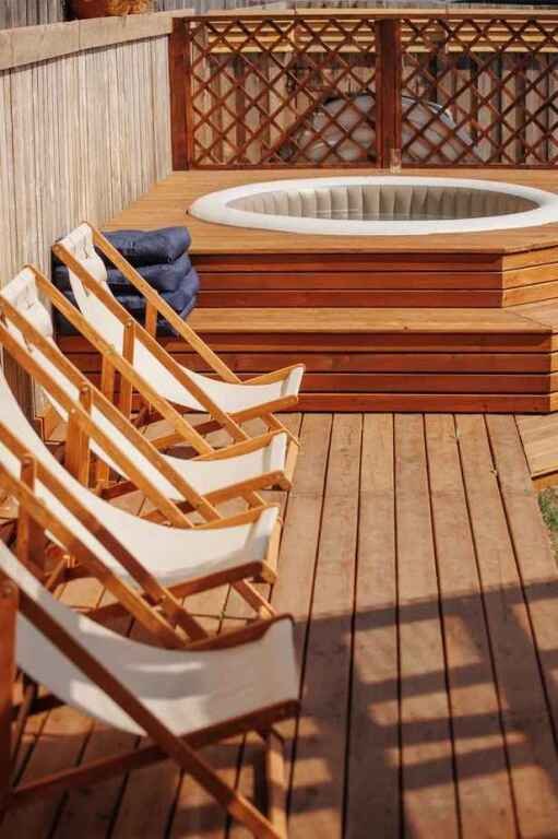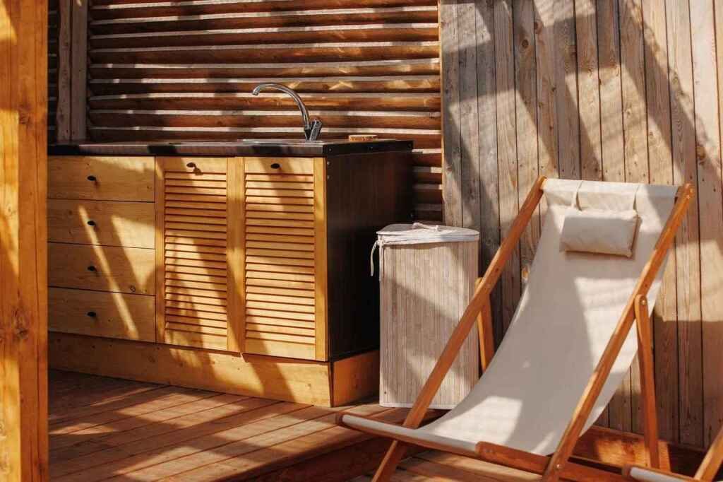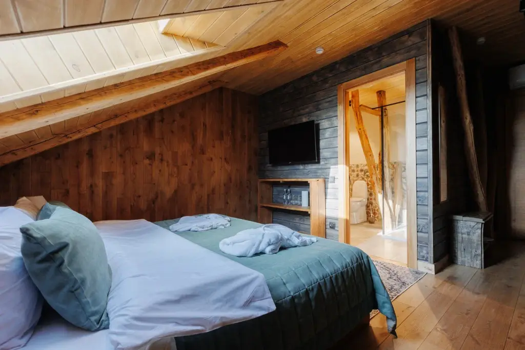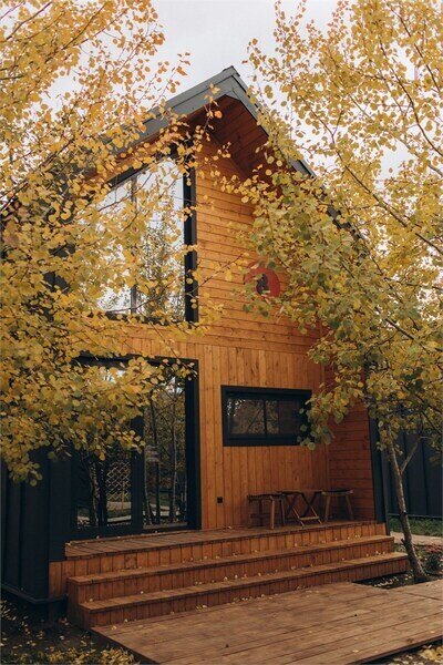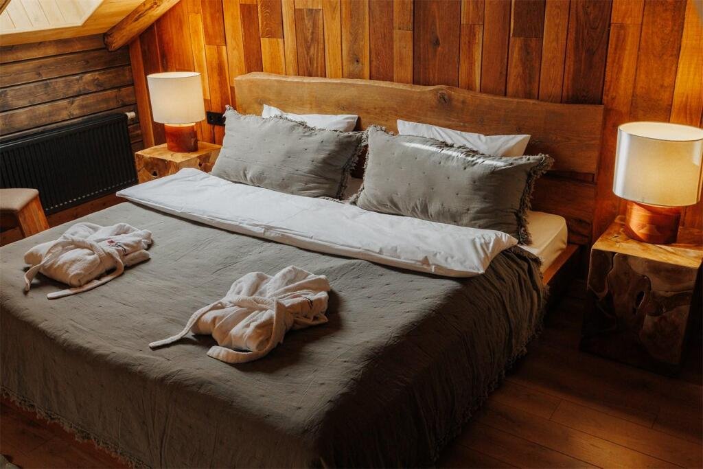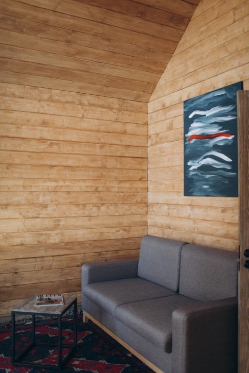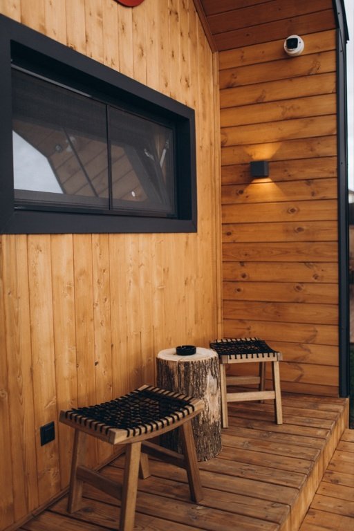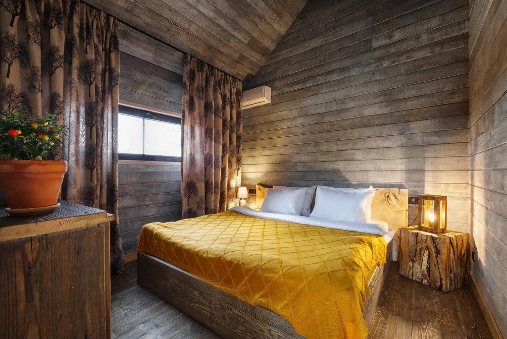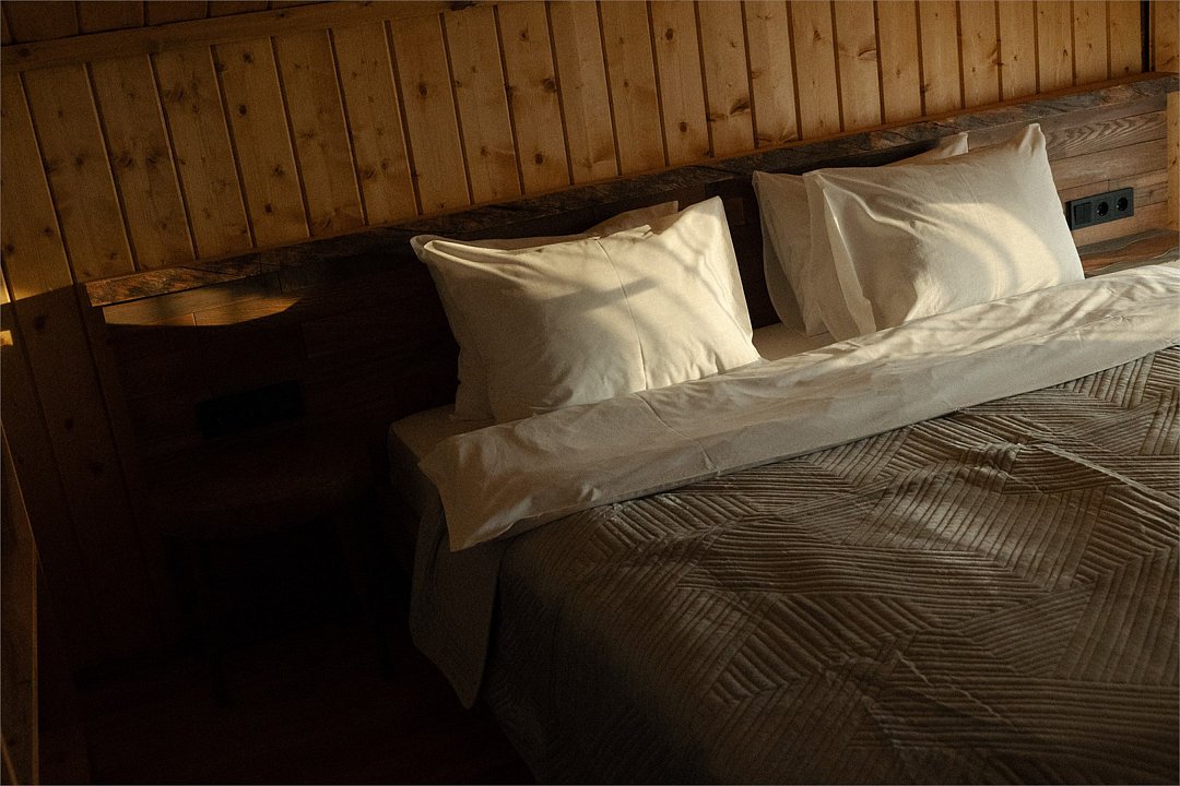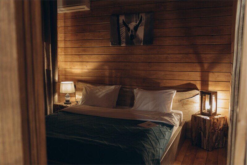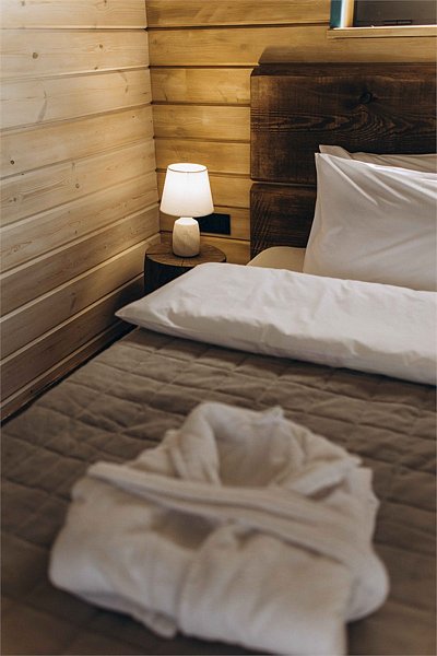 Двухместный уютный глэмпинг для любителей уединенного отдыха на природе. Глэмпинг оснащен всем необходимым для комфортного отдыха — кровать размера king-size, косметические принадлежности, полотенца, халаты и тапочки. У каждого глэмпинга есть собственная терраса.