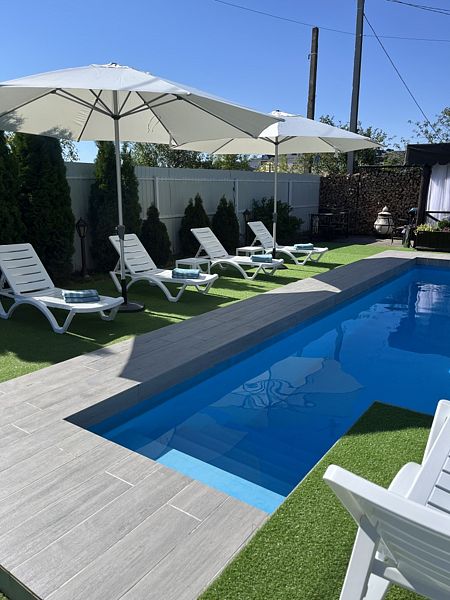 Тип бассейна: открытый бассейнРядом с бассейном: шезлонги, полотенцаРазмеры: 4 x 7 мПлощадь: 28 м²Глубина: 1600 смКомфортабельный сезонный бассейн с постоянной фильтрацией воды.