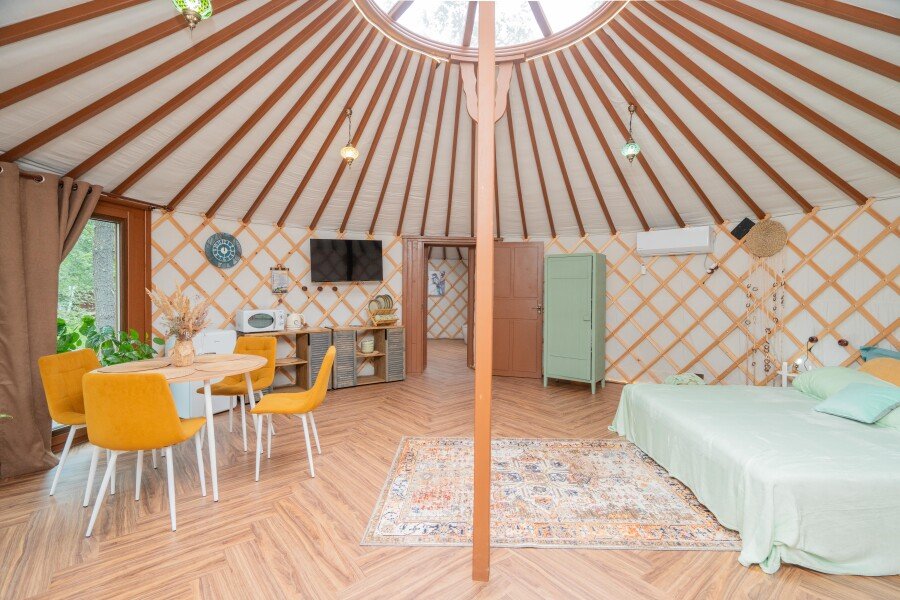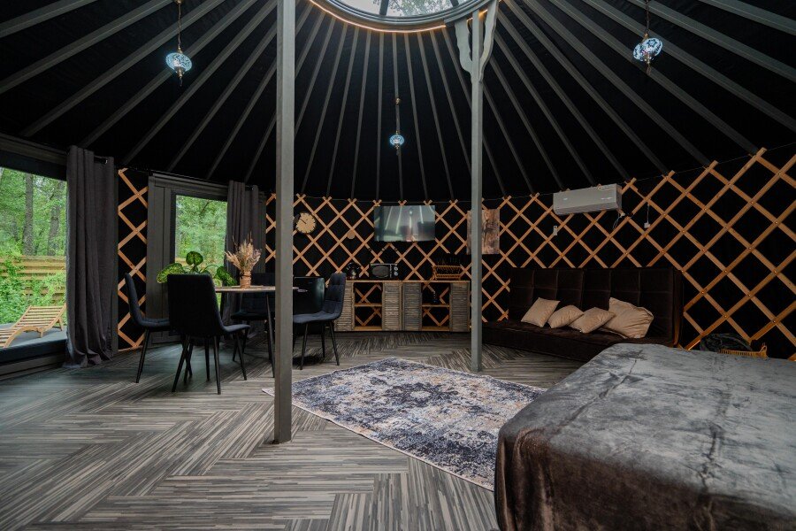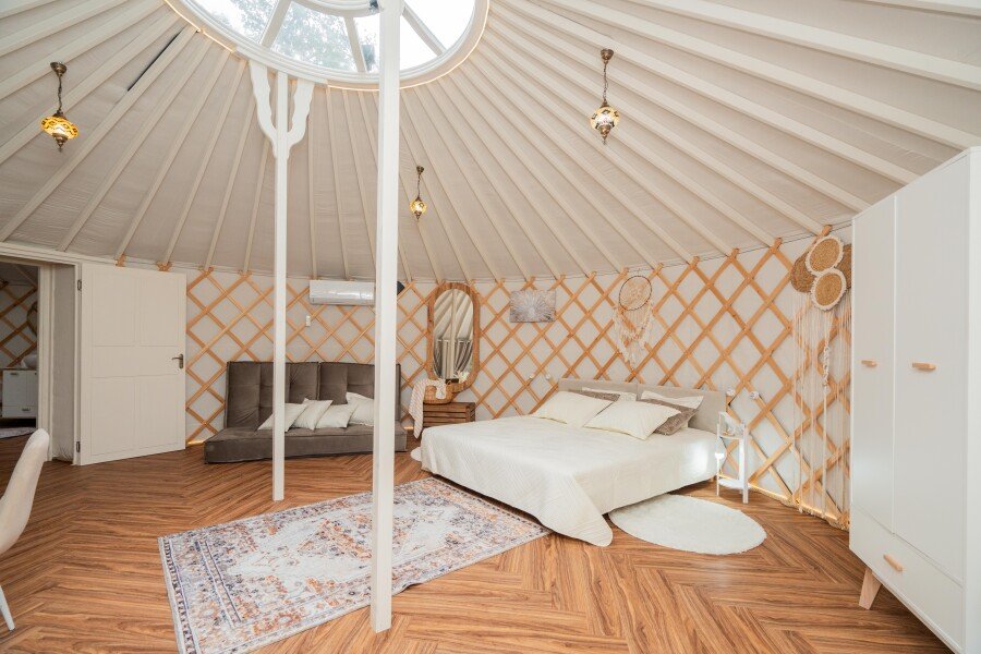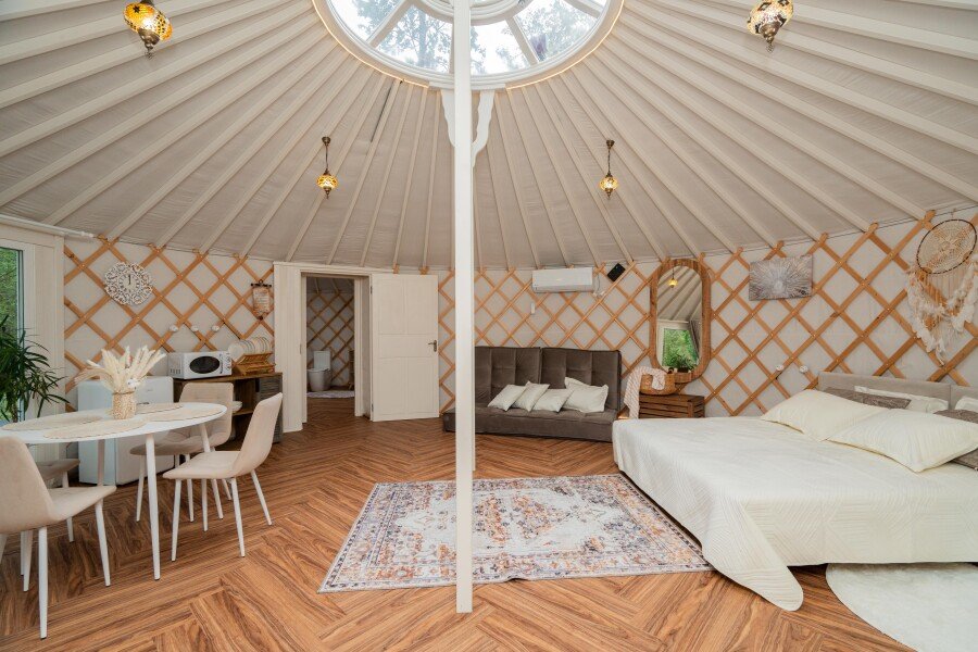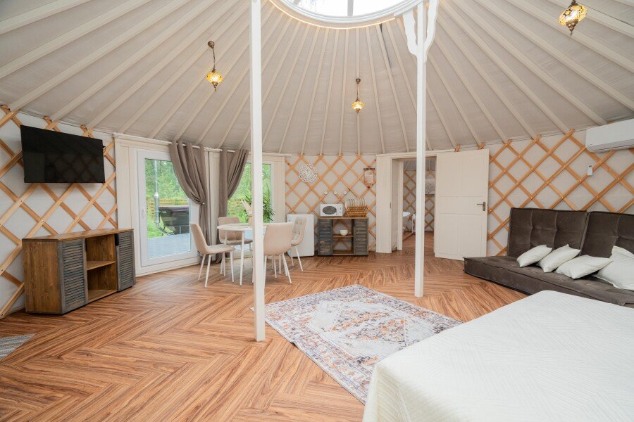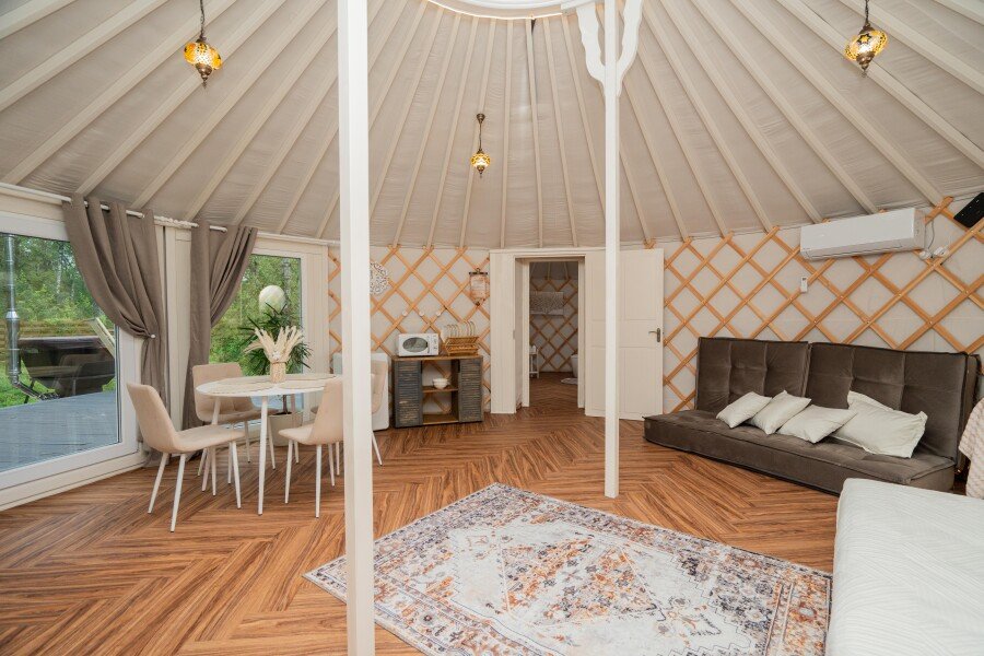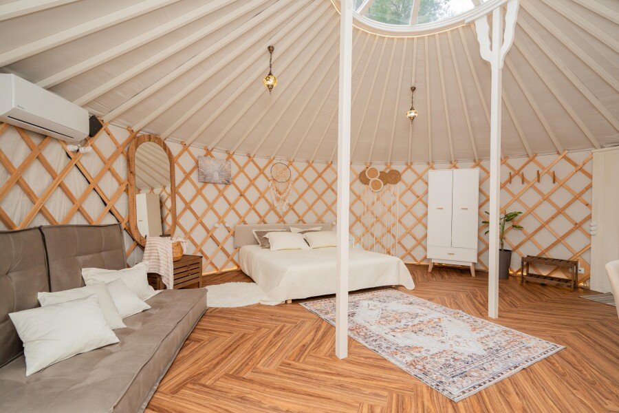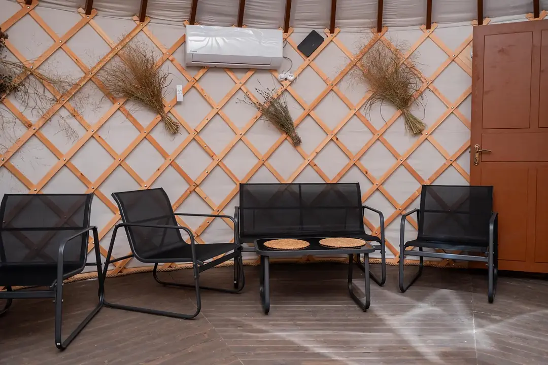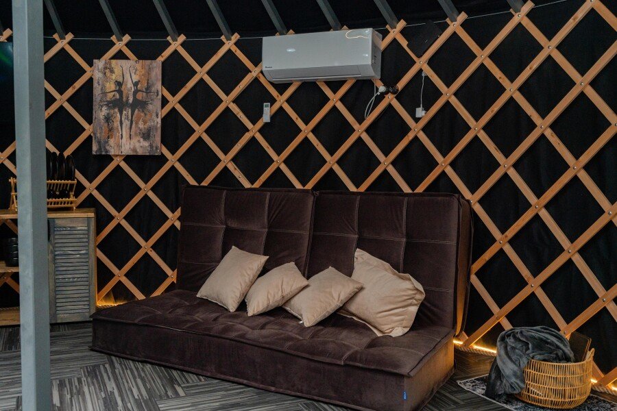 Просторное внутреннее помещение юрты оборудовано всем необходимым для комфортного проживания: удобной мебелью, современной системой отопления и уютной зоной отдыха, где можно расслабиться после насыщенного дня.