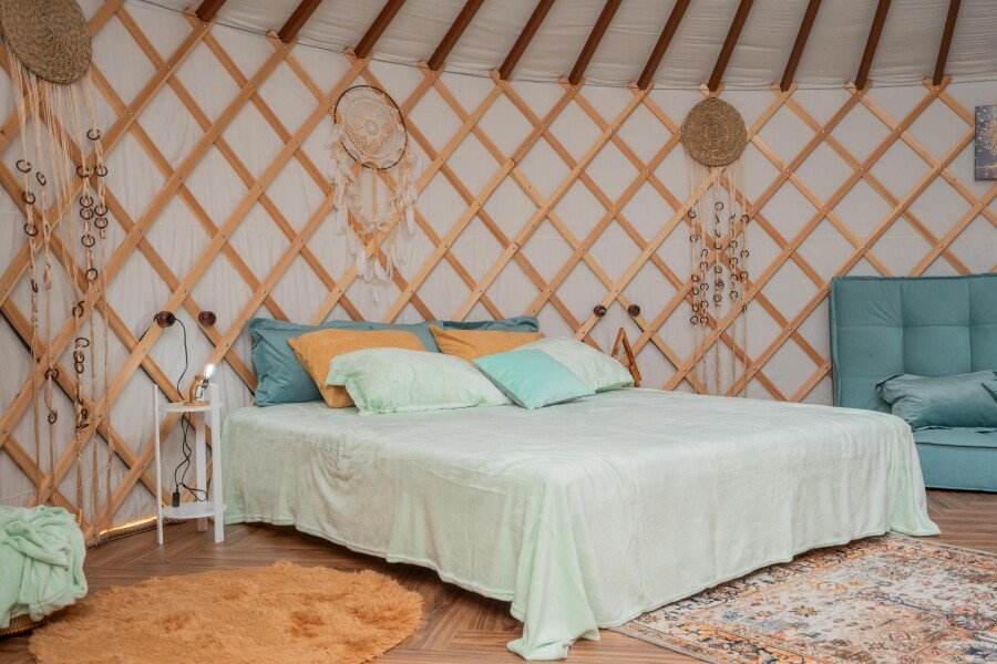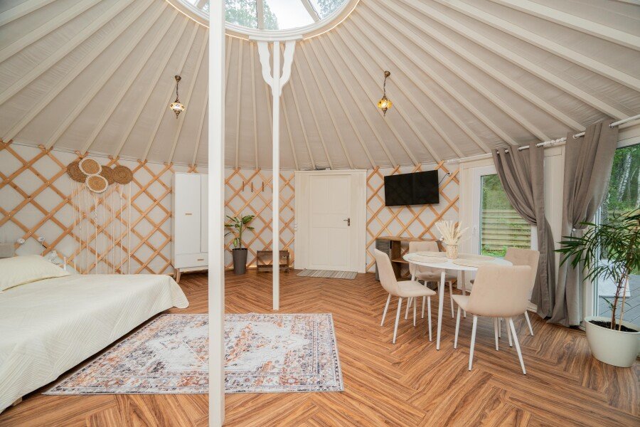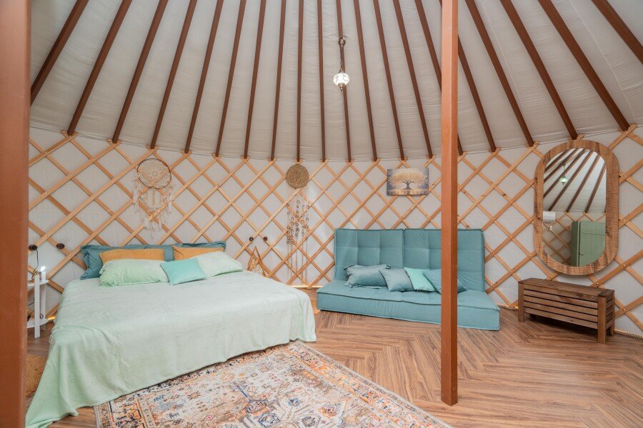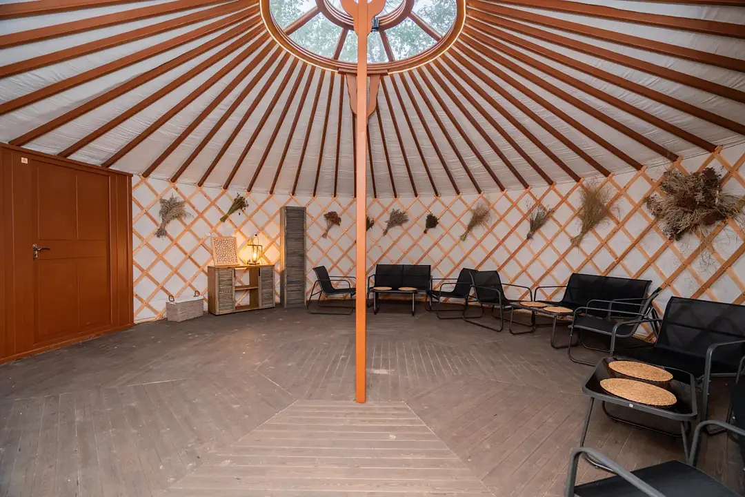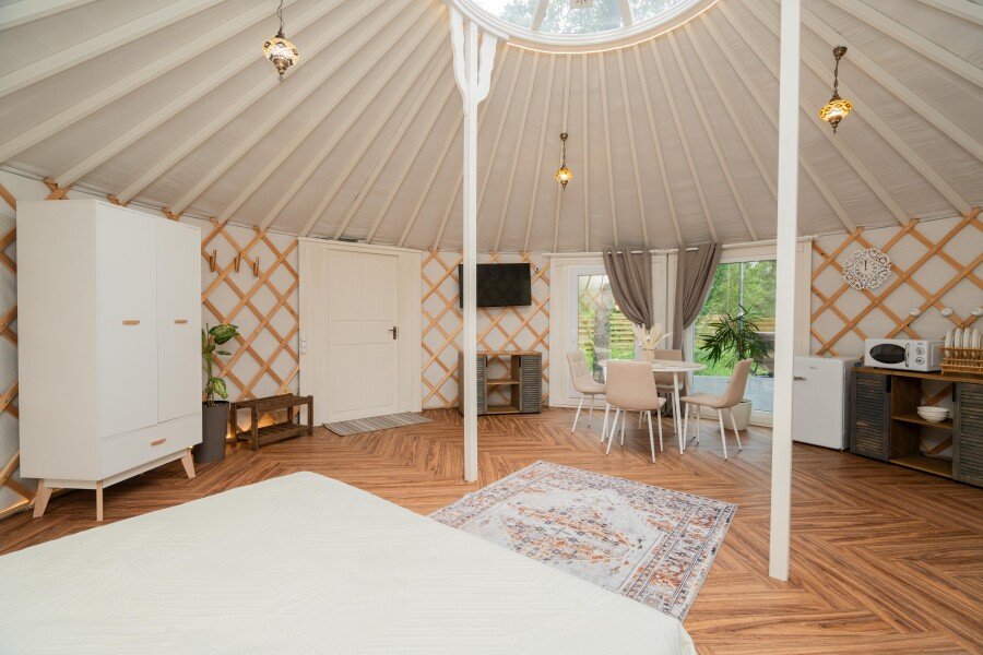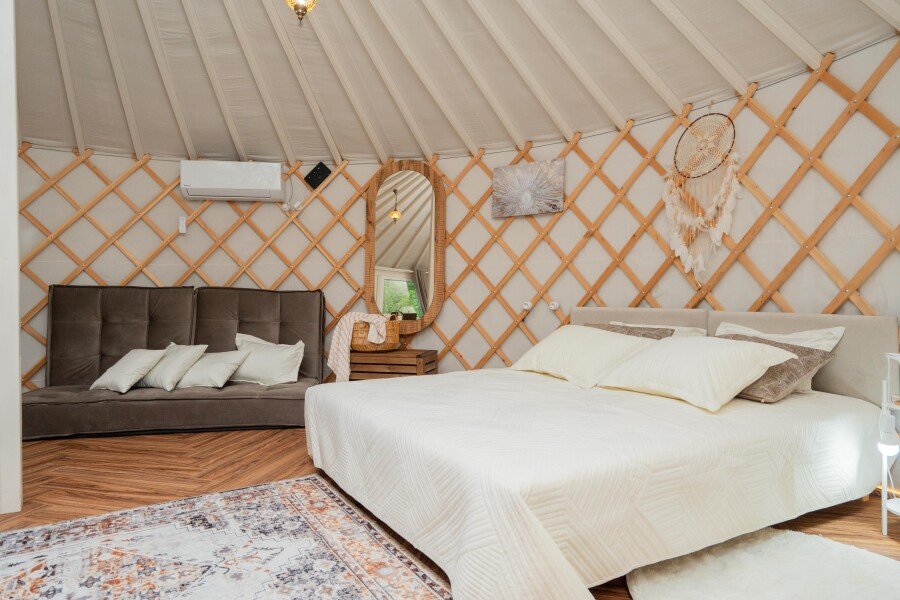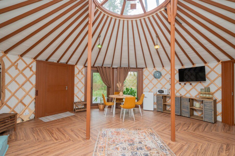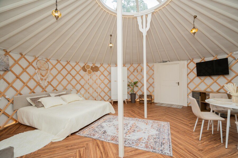 Просторное внутреннее помещение юрты оборудовано всем необходимым для комфортного проживания: удобной мебелью, современной системой отопления и уютной зоной отдыха, где можно расслабиться после насыщенного дня.