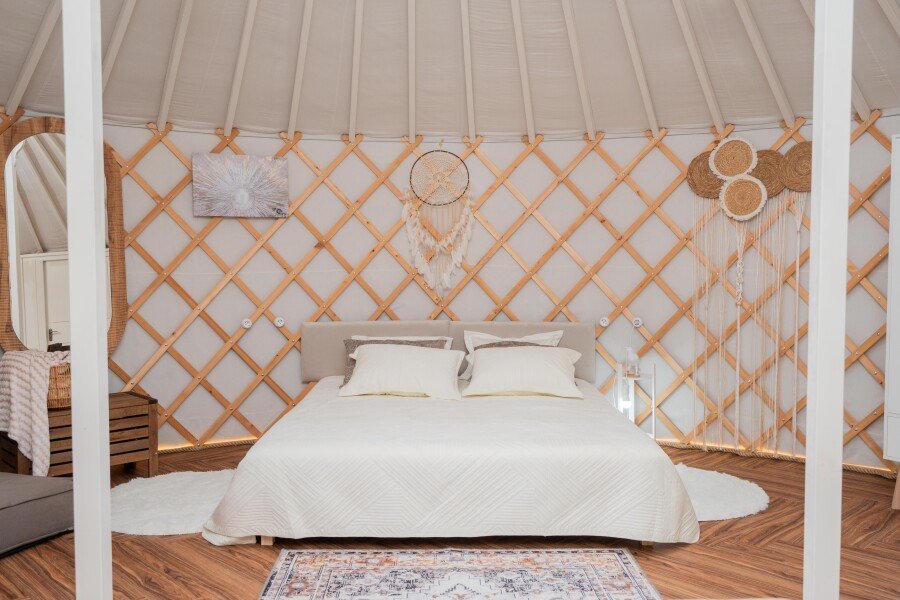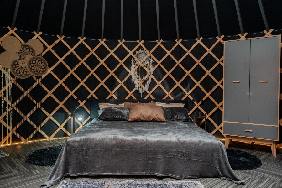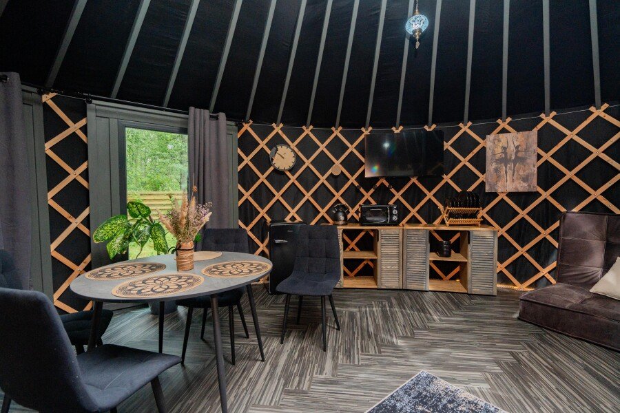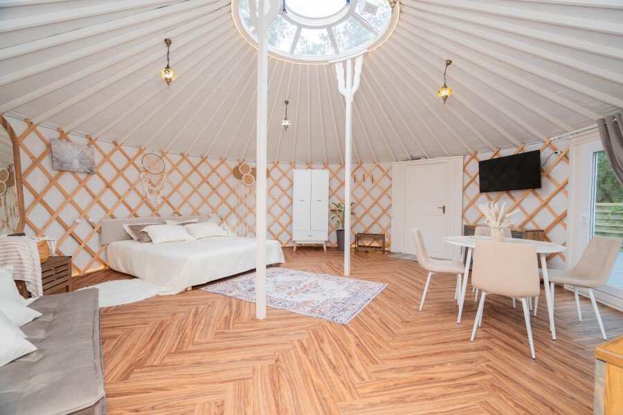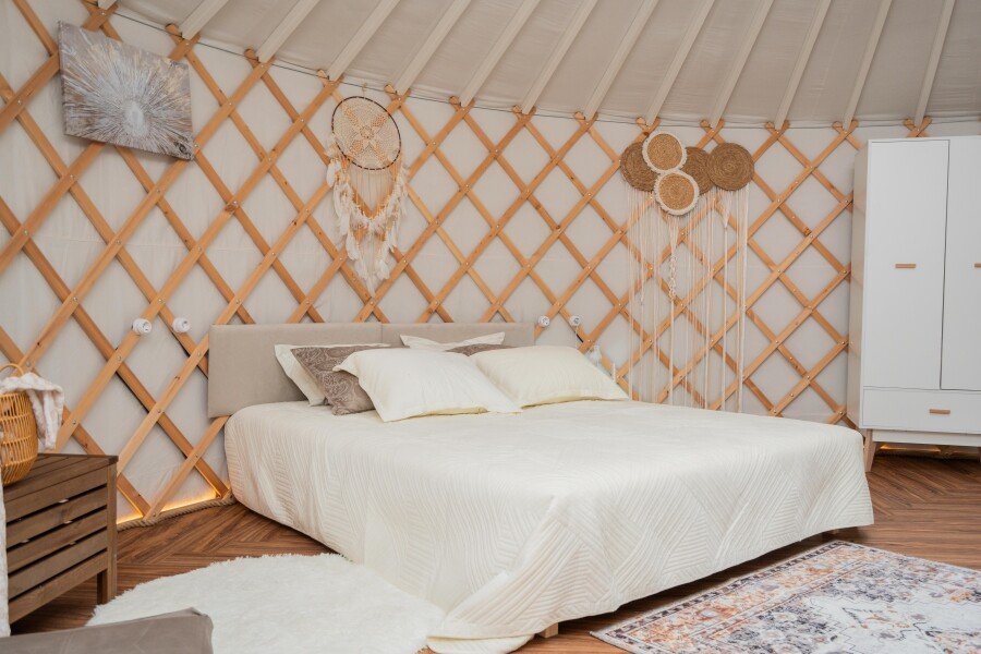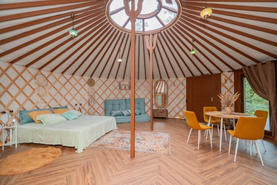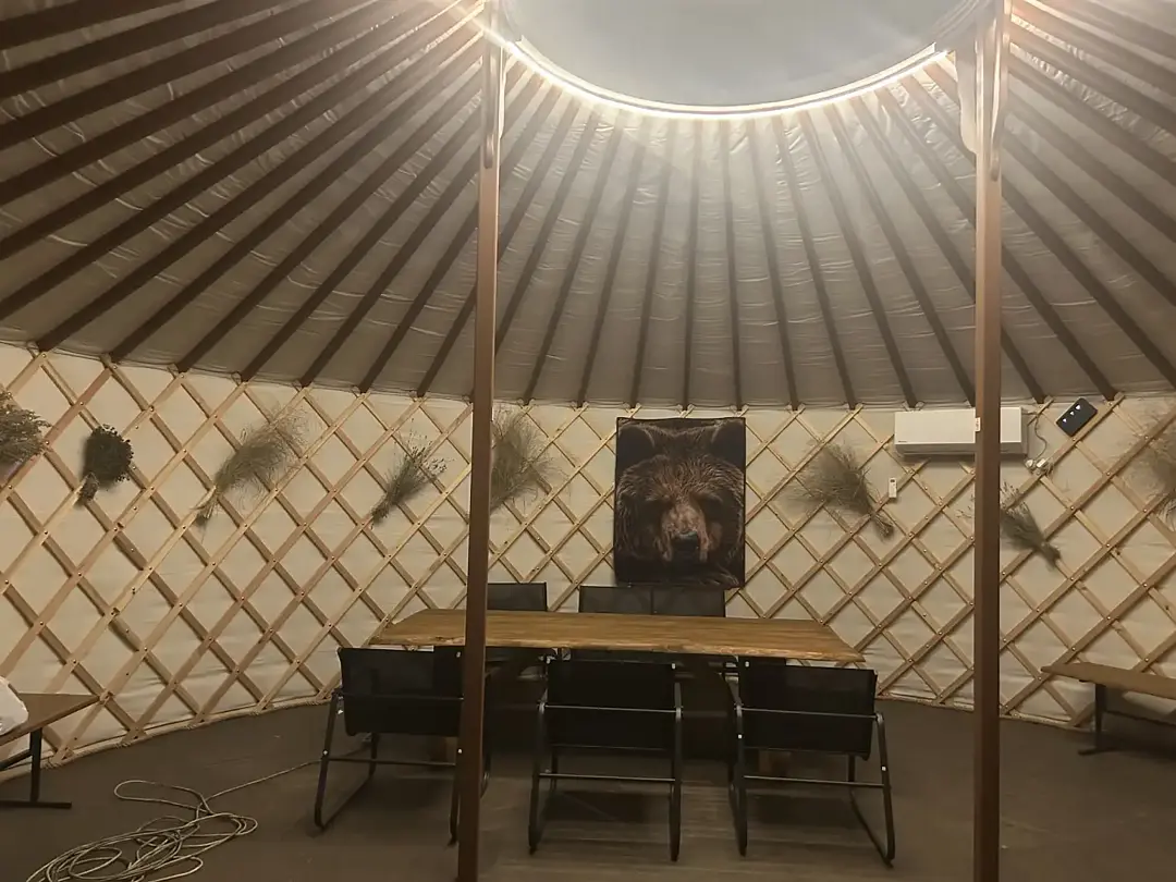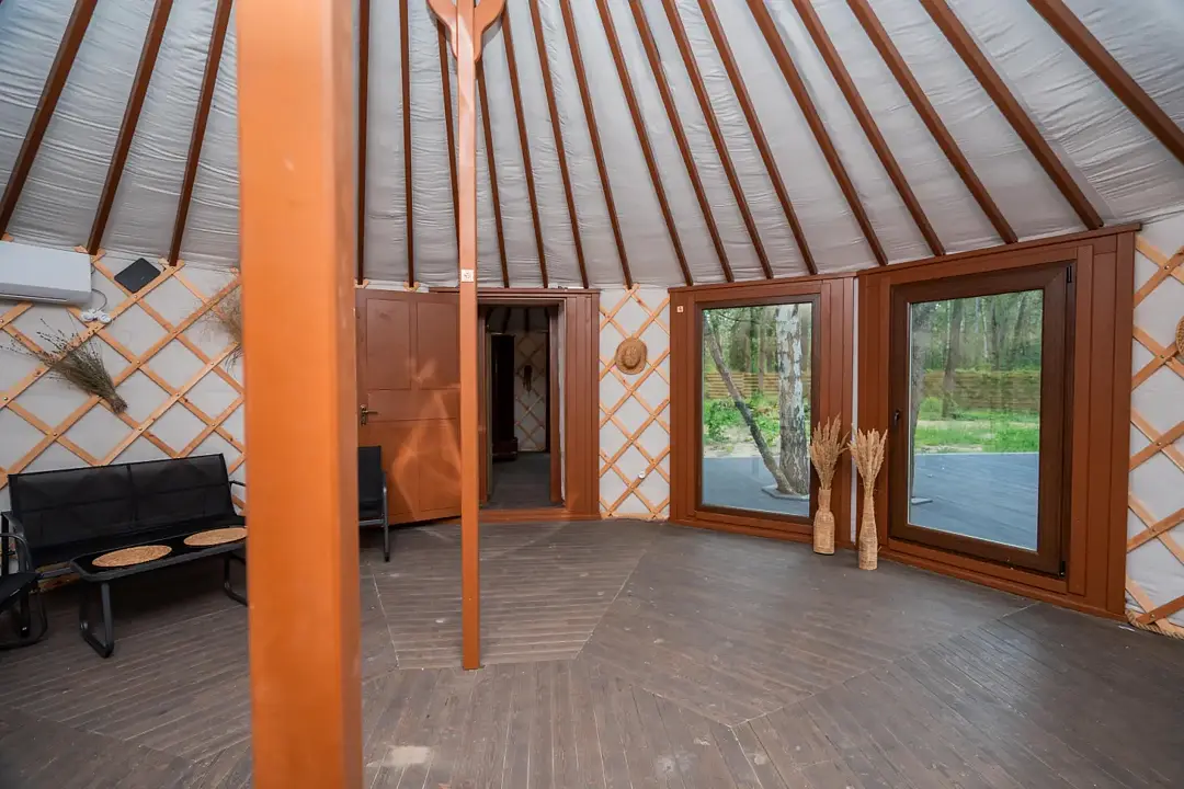 Просторное внутреннее помещение юрты оборудовано всем необходимым для комфортного проживания: удобной мебелью, современной системой отопления и уютной зоной отдыха, где можно расслабиться после насыщенного дня.