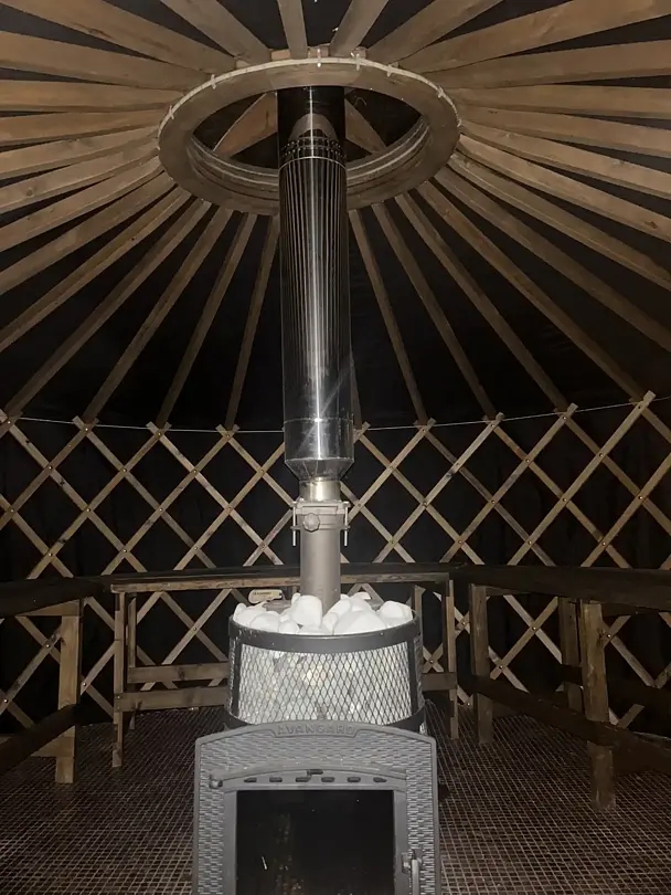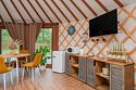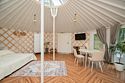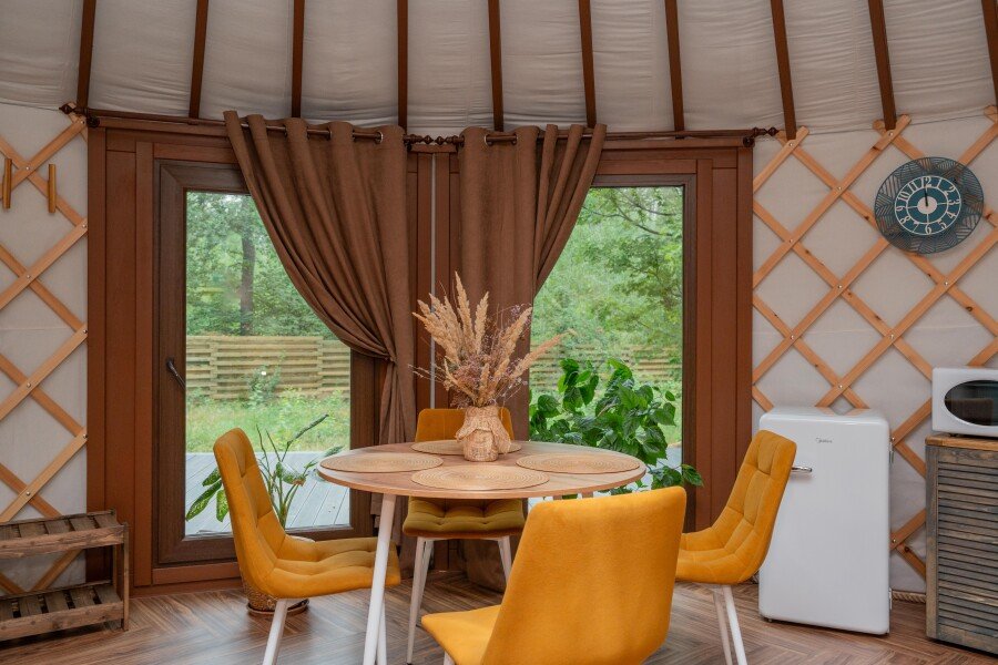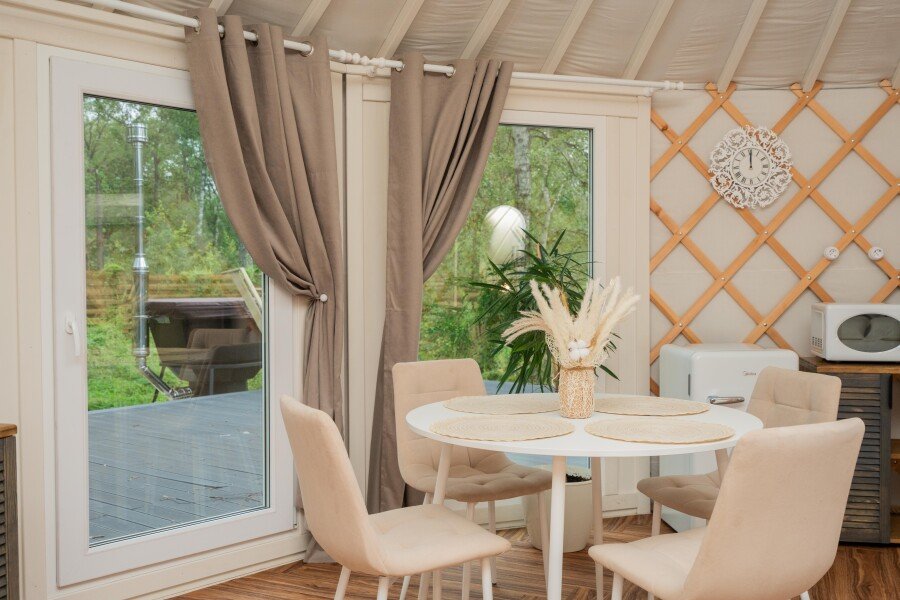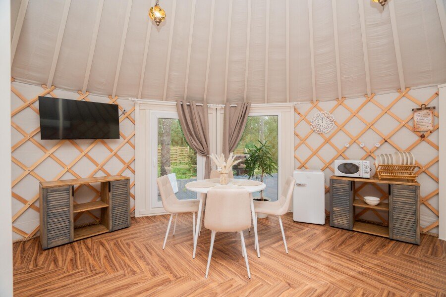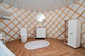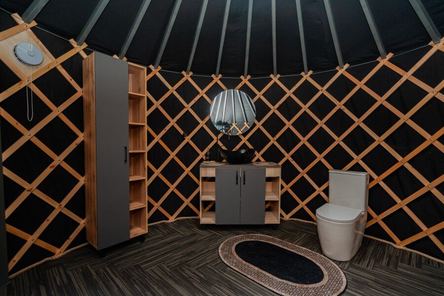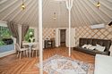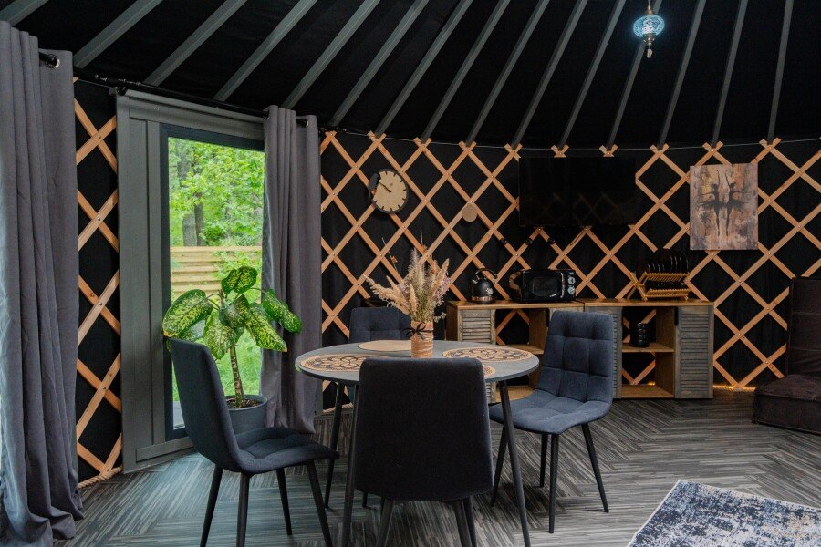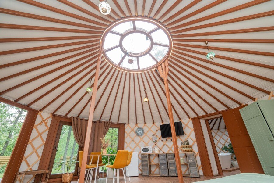 Просторное внутреннее пространство юрты наполнено уютом и комфортом: изысканная мебель, современная система отопления, уютная зона отдыха и изысканный интерьер создают атмосферу благородной простоты и изысканности.
