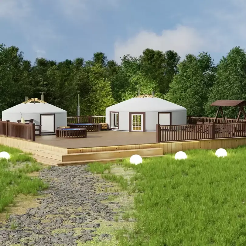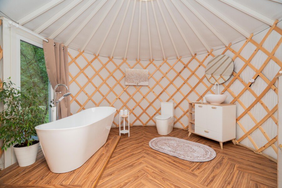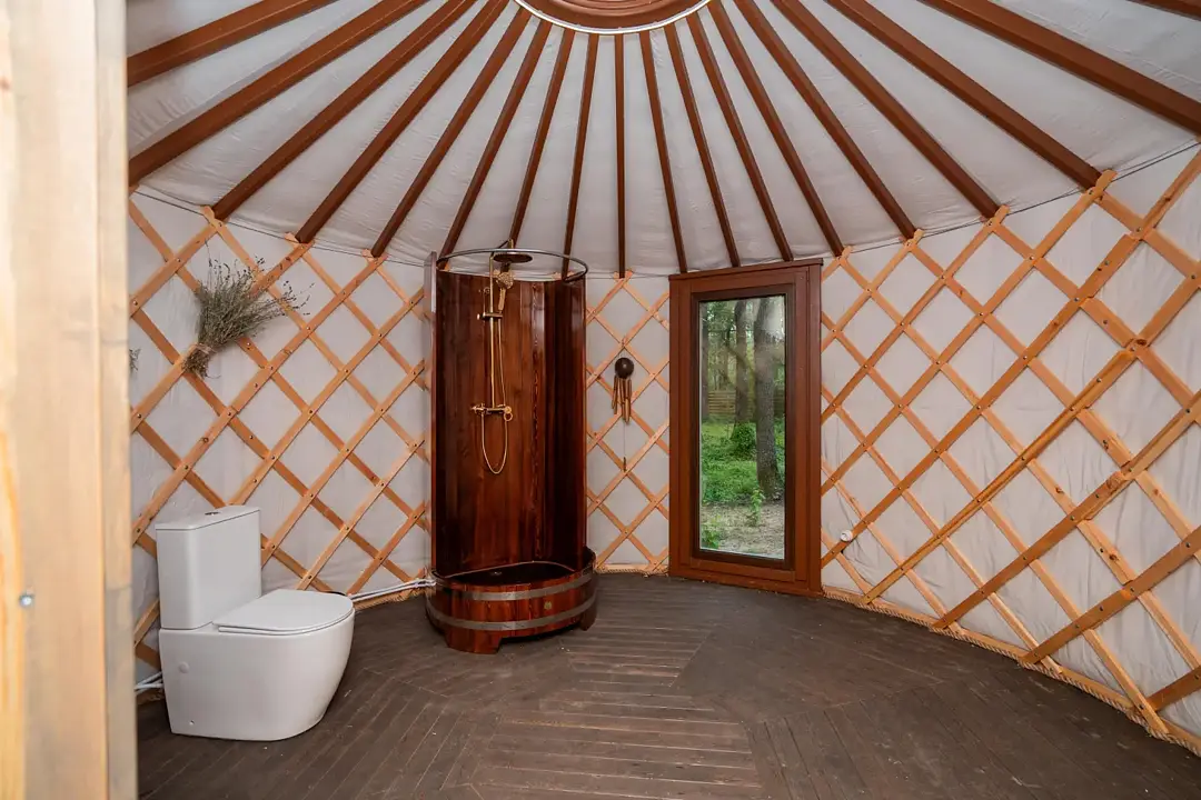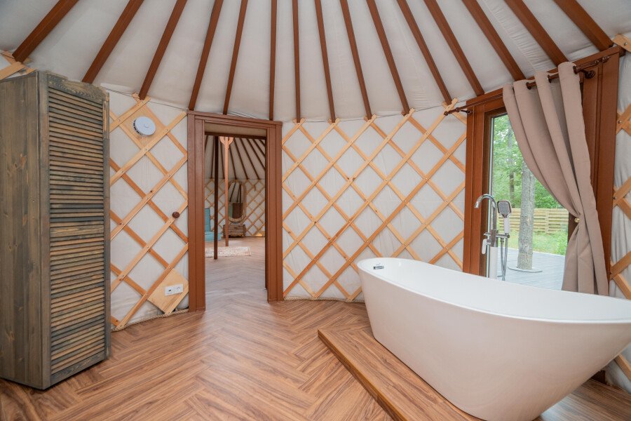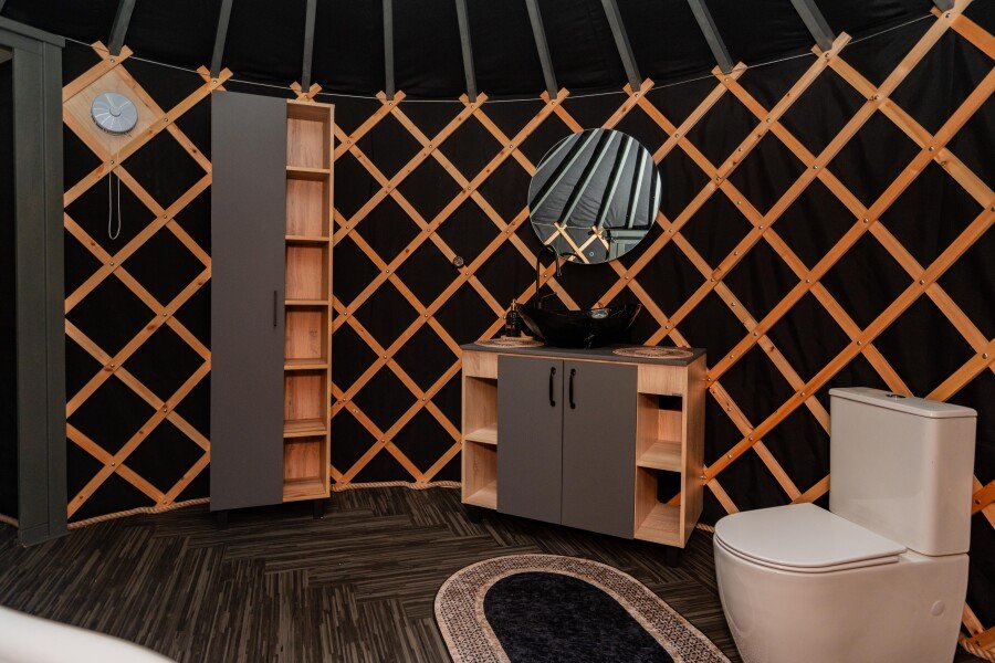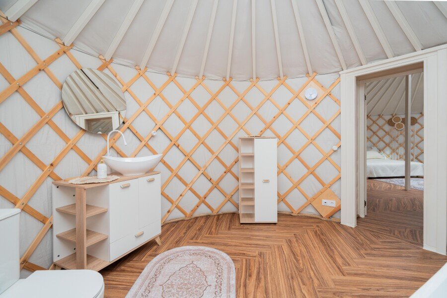 Для проживания гостей предлагаются комфортные юрты, которые сочетают в себе древние традиции и современные удобства. Внутри каждой юрты имеется холодильник, телевизор, микроволновая печь, набор посуды, кондиционер, а также собственный санузел с ванной. Просторное помещение оборудовано современной системой отопления, зоной отдыха и большой террасой с шезлонгами для отдыха на свежем воздухе.
