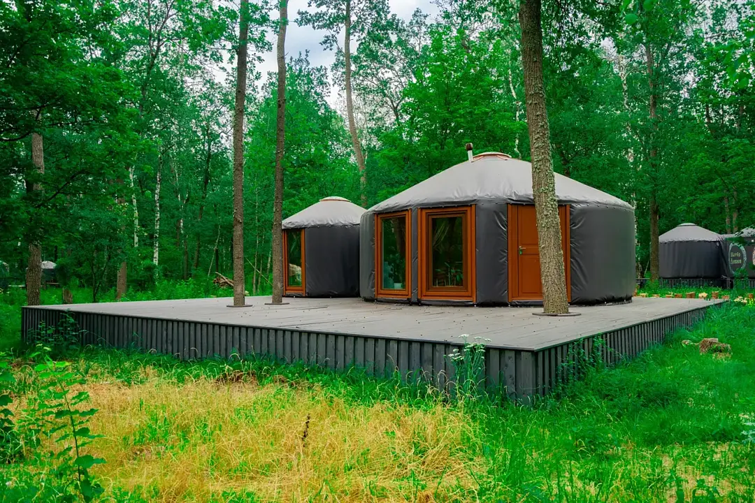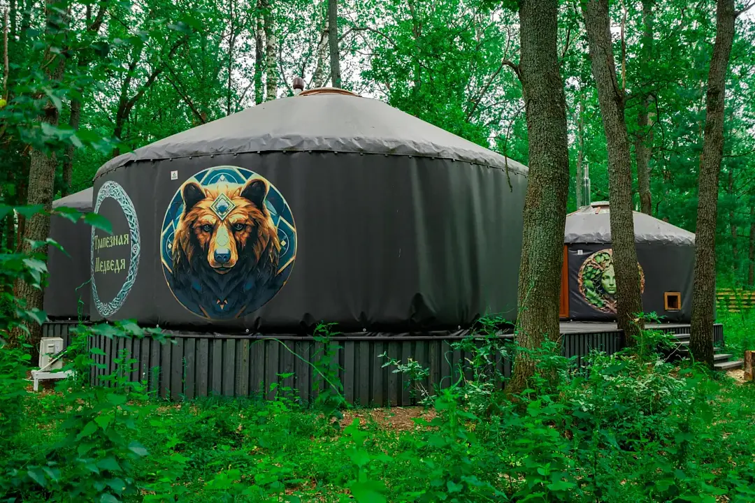 Уютная юрта «Лада» расположилась в живописном уголке леса на территории современной базы отдыха, где традиционная архитектура гармонично сочетается с комфортом.