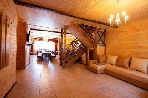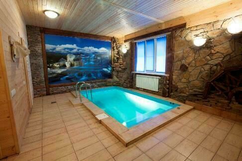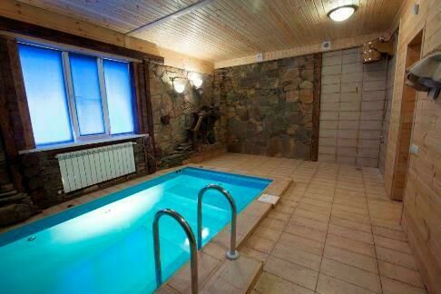 Гостиная, вместительностью до 30 человек ( огромный кожаный угловой диван, большая обеденная группа, кухонный гарнитур, микроволновая печь, холодильник, чайник, спутниковое ТВ), русская парная, подогреваемый бассейн с функцией гидромассажа, отдельный санузел, душ.