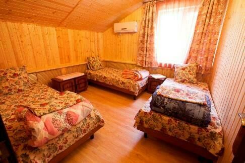 Холл с большим диваном, 4 спальных комнаты (три спальни с тремя отдельно стоящими кроватями, одна спальня с двумя односпальными кроватями), санузел (душ, умывальник, туалет)