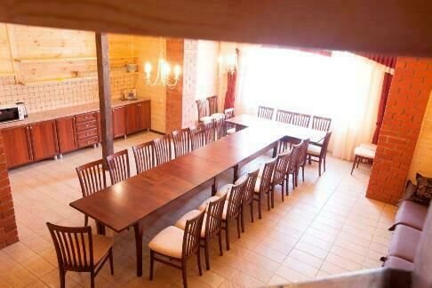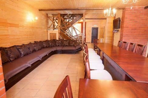 - Большой гостиной, в которой располагается деревянные стол и скамейки, а также для удобства имеется дополнительная столешница для нарезки продуктов к предстоящей трапезе.