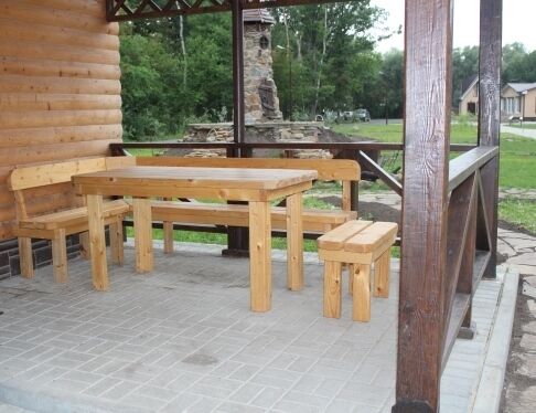 - Уютной гостиной, в которой располагается деревянные стол и скамейки, а также для удобства имеется дополнительная столешница для нарезки продуктов к предстоящей трапезе.