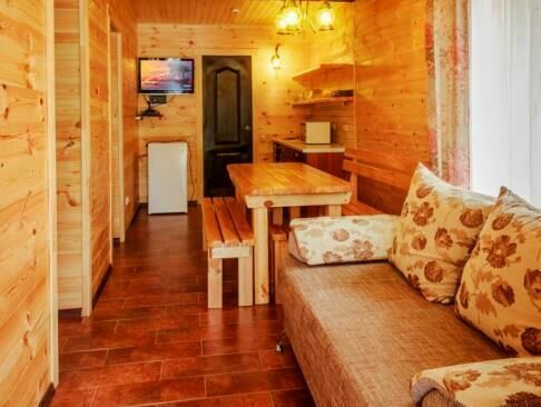 - Уютная гостиная, в которой есть всё для того, чтобы ощущать комфорт во время отдыха продолжительное время, это- холодильник, спутниковое телевидение, микроволновая печь, посуда для каждой персоны. Для удобства в гостиной есть деревянный кухонный уголок, состоящий из большого обеденного стола, скамеек и табуретов, а так же кухонный гарнитур.