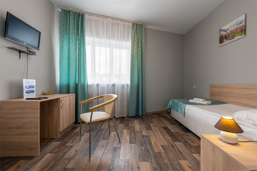 Путешествие с семьейДля путешествующих на машине.Были здесь в 2013 г., в этом году ехали сюда уже целенаправленно. Отель расположен в спальном р-не среди новостроек, на машине до центра порядка 20 мин. В целом, неплохо. Персонал вежлив, номера чистые, все необходимое - душ, туалет, горячая-холодная вода, телевизор, шкаф для одежды, прикроватные тумбочки в номере есть. Wi-Fi присутствует.