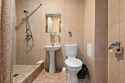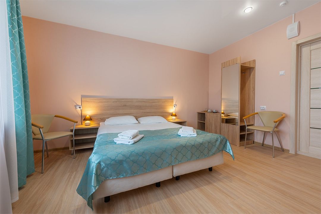В номере находится двуспальная кровать, прикроватные тумбы, шкаф для одежды, стол, стул, телевизор. В ванной комнате находится душ, туалет, раковина.