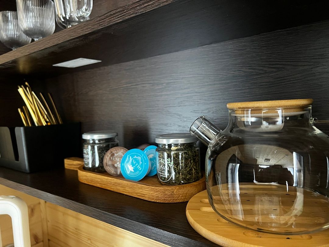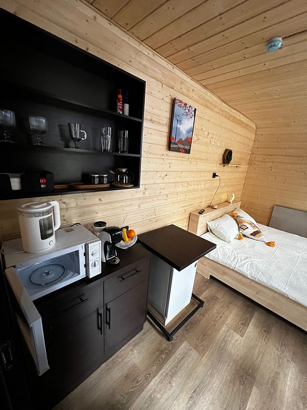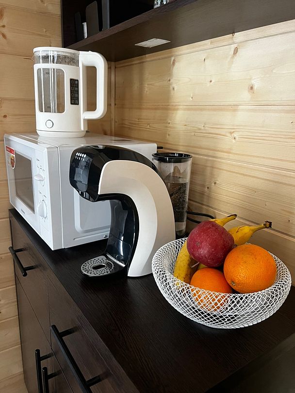Для гостей: телевизор, микроволновая печь, чайник, фен. Чай листовой и пакетированный. Посуда, столовые приборы. Банные принадлежности. Полотенца из микрофибры и одноразовые тапочки. Шапочки (общие).