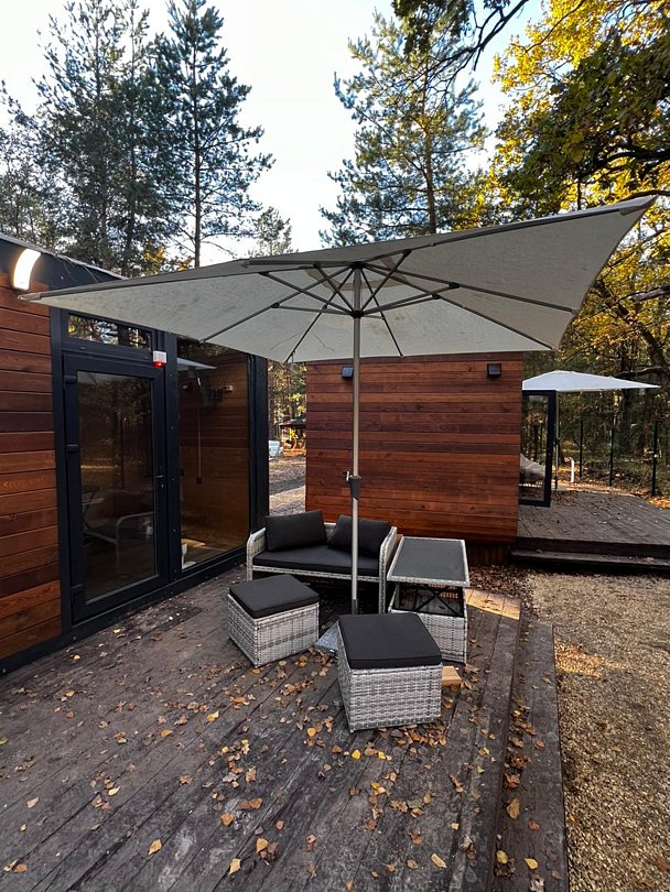 У бани уютная терраса с мебелью и зонтиком на случай дождика.