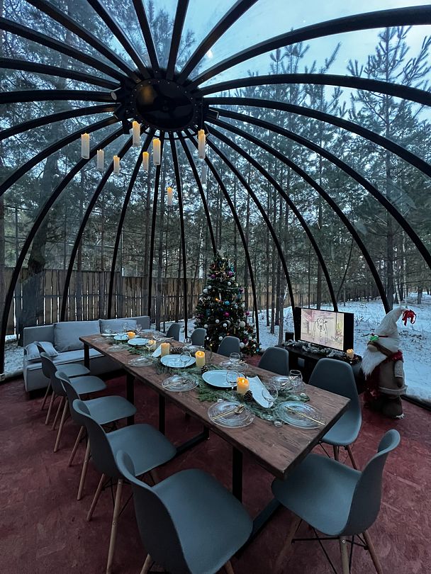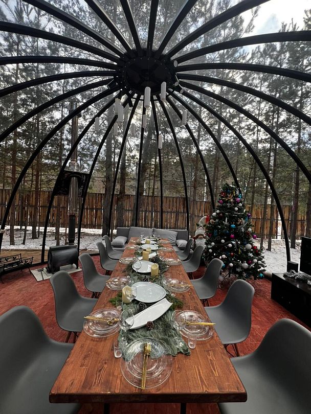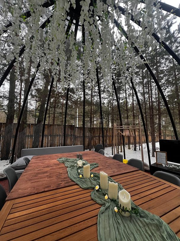 Интересное место для вашего мероприятия. Корпоратив, день рождения, свадьба, годовщина, лекции и мастер-классы. Прозрачный купол в окружении сосен. Отапливаемый и комфортный. Оснащен всем необходимым: мебель, телевизор, колонка Алиса, электрический чайник, посуда. Сервировка и декор входит в стоимость. Для гостей зоны беседок оборудована комфортная уборная.