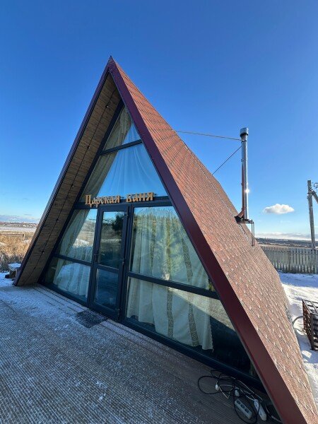 Стильным дом в стиле А-Фрейм 2024 года постройки с интерьером «Второй свет», внутри которого расположена настоящая Русская баня на дубовых дровах оплачивается отдельно по запросу!