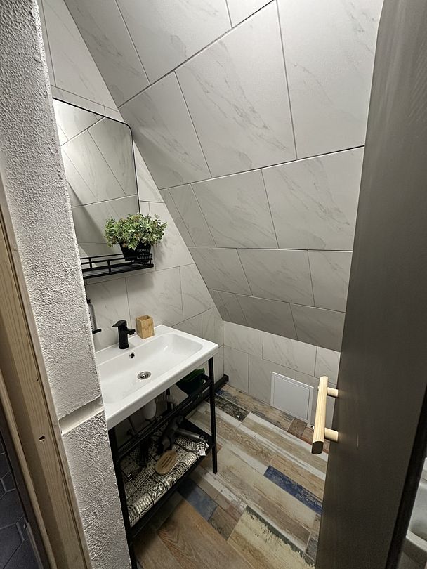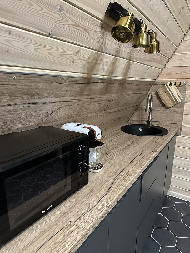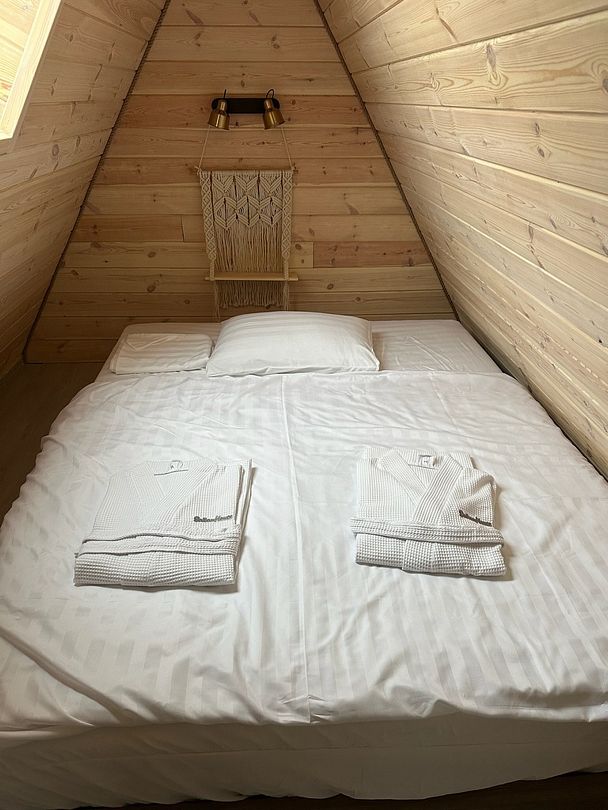 Винтовая лестница ведет на второй этаж с уютной спальней, оснащен постельным бельем и спальными принадлежностями. Премиальная уходовая косметика, предоставляются косметические наборы (зубная щетка), тапочки