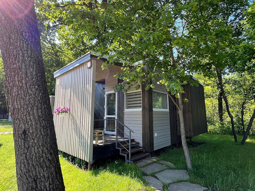 Только вы вдвоем в лесу, в уютном и комфортабельном мини-коттедже, обставленном стильной мебелью, глядя на звезды в небе и искры от костра. Ощущение природы вокруг. И со всеми услугами курорта под рукой.