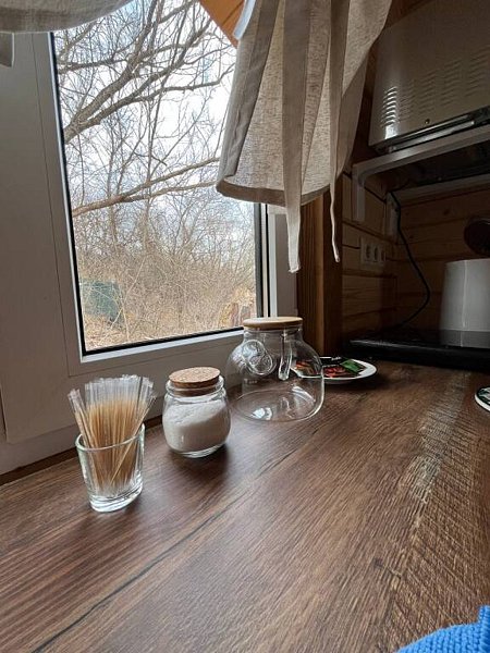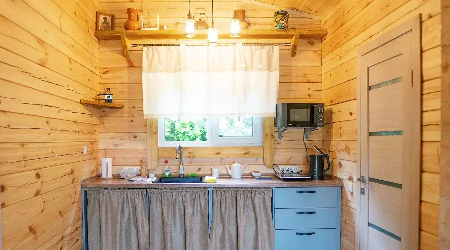 На кухне гости найдут посуду, плиту, холодильник, чайник. На территории работает кофейня.