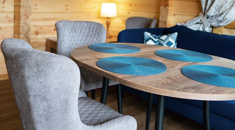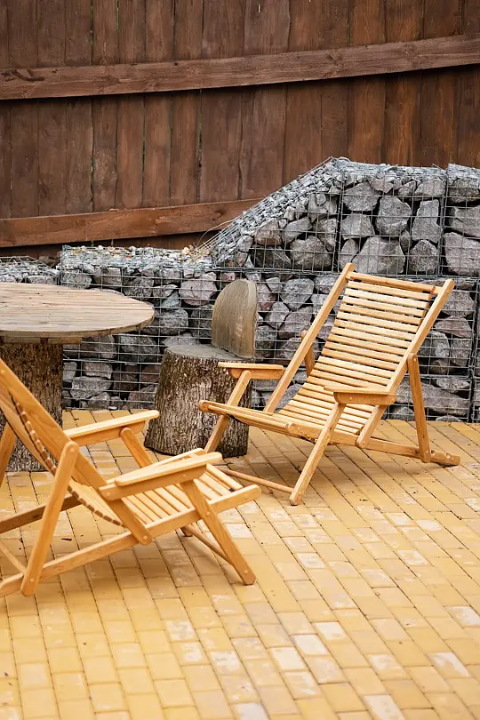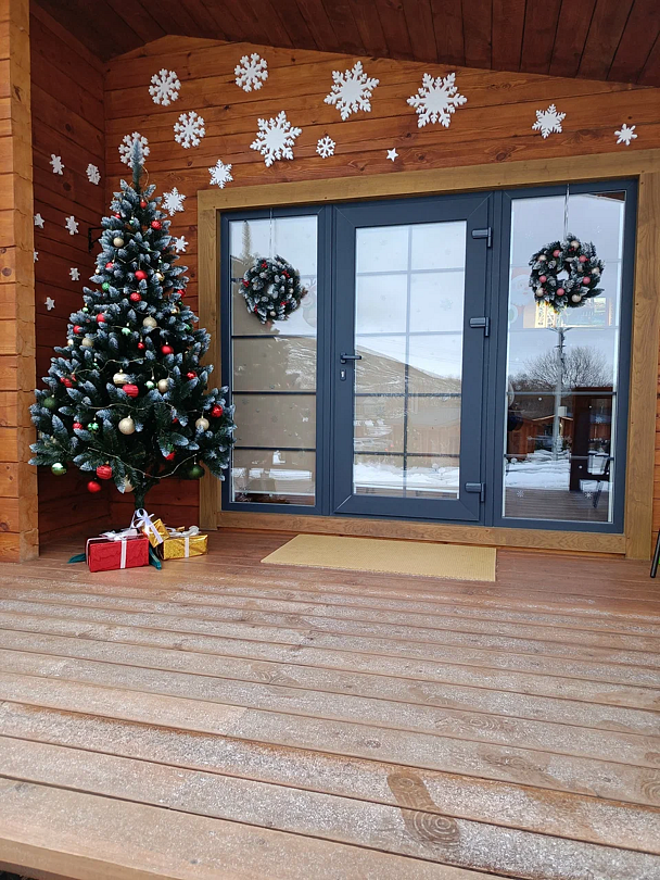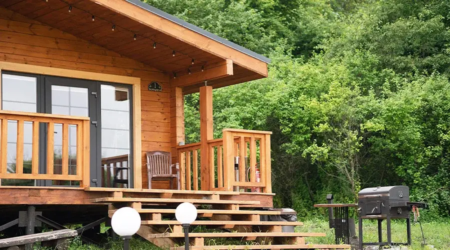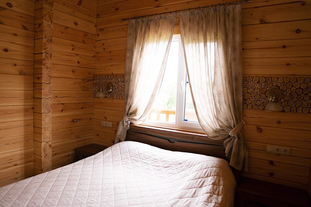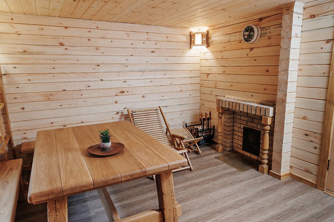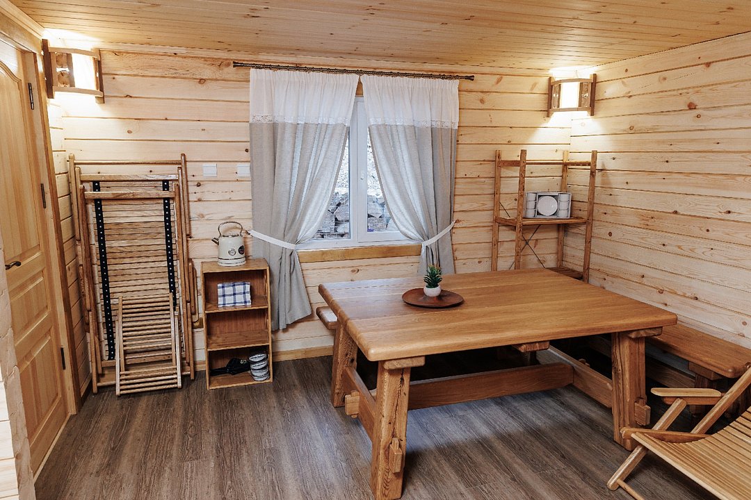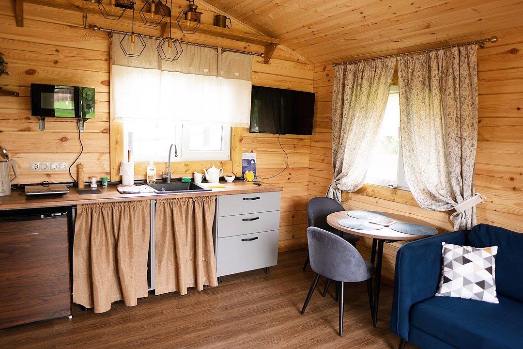 Представлены два больших деревянных домика и один маленький. У каждого есть выход на террасу и личная мангальная зона. Внутри установлена мягкая мебель, двуспальная кровать и есть ванная комната.