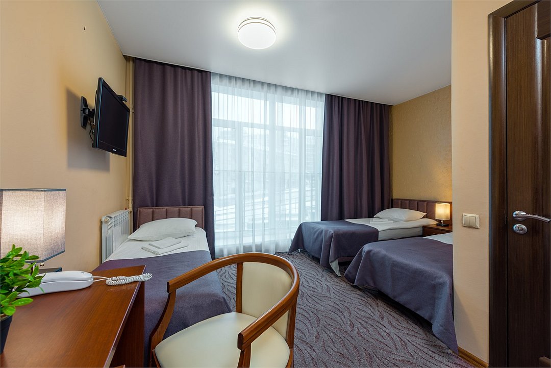 телевизор, Wi-Fi, фен, душевая кабина, банные полотенца, две односпальные кровати, тумбы, стулья, шкаф для одежды, письменный стол, унитаз, раковина, отопление, вид на город, стаканы, номер для некурящих, уборка номераВ гостиничном номере