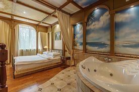 На площади 73 кв.м может расположиться большая семья или дружная компания. На первом этаже номера находится гостевая зона и мини-кухня, на втором – кабинет, спальня и джакузи.