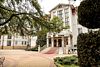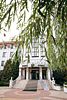 Белоснежное здание с полностью прозрачными стенами и парящей среди дубов снежной крышей. Здание окружают фонтаны, что создает волшебный визуальный и аудио эффект.