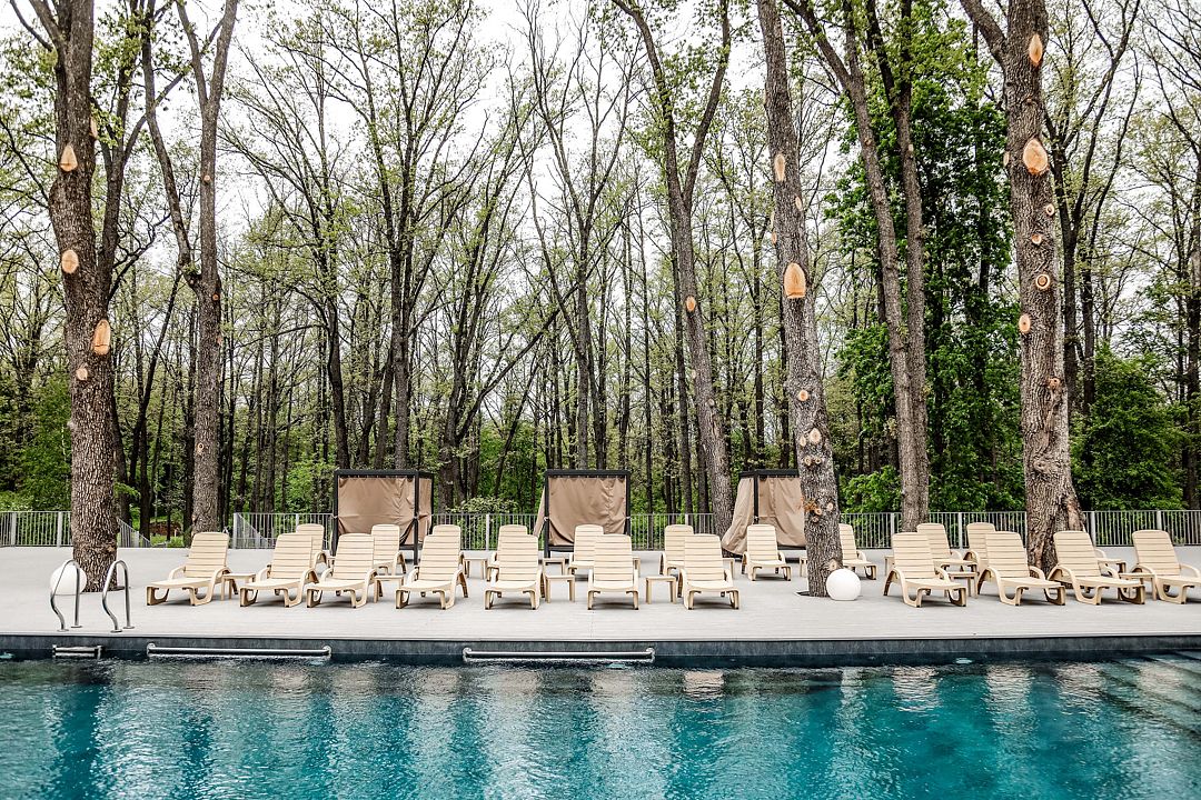 На территории отеля находятся: православный храм, 2 ресторана, банкетный зал, спа–салон, сувенирный магазин, конференц–залы, спортивный центр, термальный комплекс с бассейном, конный клуб.