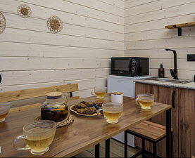В Глэмпинге вы найдете все необходимое для комфортного проживания. На Ваш выбор есть три домика, каждый из которых оборудован всем необходимым. Внутри вы найдете уютную спальню, современную ванную комнату, полностью оборудованную кухню и просторную гостиную зону, где вы сможете провести время с семьей или друзьями.
