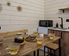 - Просторная комната отдыха с большими окнами, Алисой, столом и лавками, кухней с микроволновкой, посудой и холодильником;