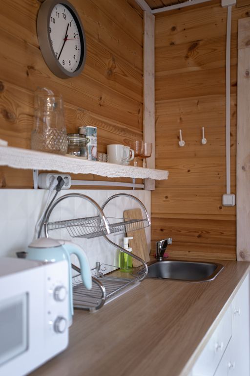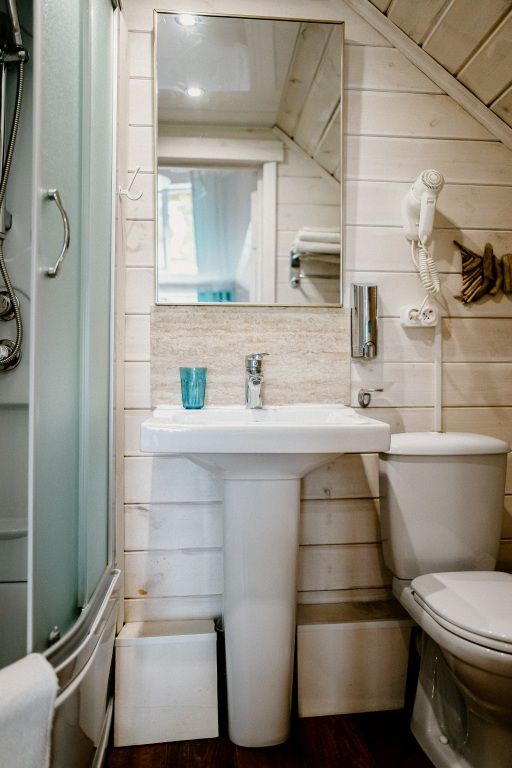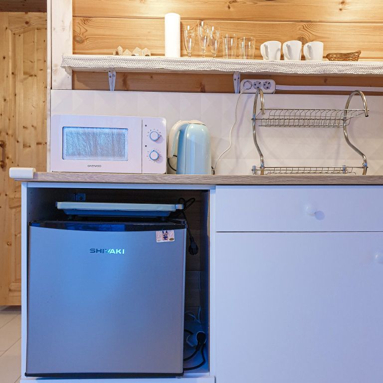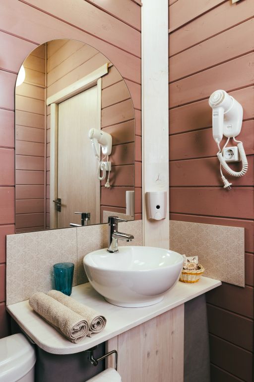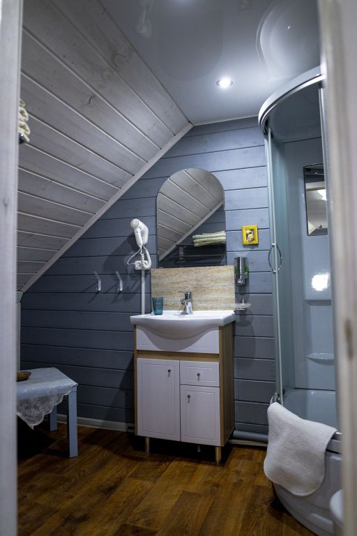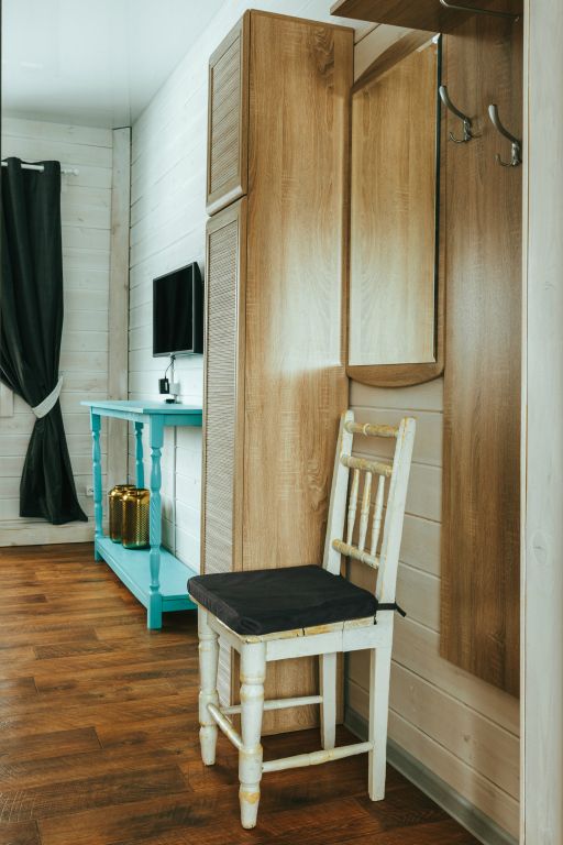 24 кв .м., кровать 160 см, сан узел с душевой кабиной, TV, Wi-Fi, полотенца, косметические принадлежности, тапочки, подушки с эффектом памяти, ортопедический матрас, холодильник, чайник, СВЧ, посуда, столик и стулья, панорамные окна на березовую рощу, мебель из натурального дерева, индивидуальная веранда с садовой мебелью.
