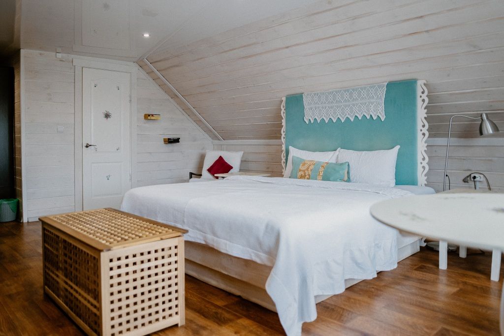 В интерьере номера игра контрастов: белоснежное покрывало и ярко-красные шторы из бархата. Тип кровати: двуспальная кровать Queen size. Ванная комната: душевая кабина и сан. узел совмещенные, комплект косметики для душа, тапочки, фен, комплект полотенец. Уютный номер располагает к спокойному отдыху, большая и удобная кровать с белоснежным бельем сделает Ваш сон комфортным. В свободное время можно разместиться в просторном холле за чашечкой чая, а утром насладиться вкусным домашним завтраком.