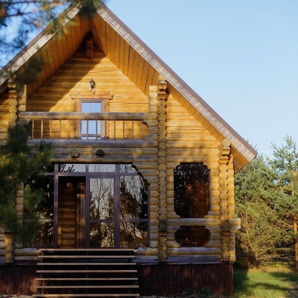 2-х этажный деревянный дом на берегу реки с большим балконом.