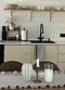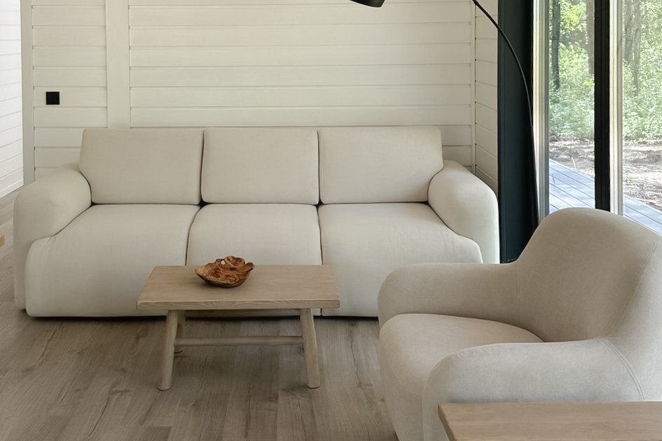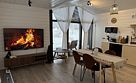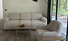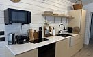 Дом включает две изолированные спальни: первая с кроватью с ортопедическим матрасом 160x200 см, вторая — аналогичная. Обе спальни оборудованы шторами блэкаут и имеют выход на террасу с зоной для отдыха. Светлая просторная гостиная совмещена с кухней и обеденной зоной, где стоит раскладной диван 160x200 см. Кухня оборудована всей необходимой посудой для шести персон, а также электрической плитой, холодильником, микроволновой печью, посудомоечной машиной, духовым шкафом, чайником, а также капсульной кофемашиной и тостером.